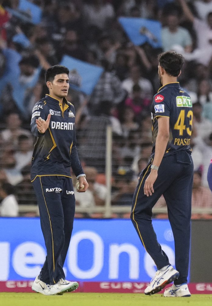 Ahmedabad: Gujarat Titans' Prasidh Krishna celebrates with captain Shubman Gill after taking the wicket of Rajasthan Royals’ Jofra Archer during an Indian Premier League (IPL) 2025 T20 cricket match between Gujarat Titans and Rajasthan Royals, at the Narendra Modi Stadium, in Ahmedabad, Wednesday, April 9, 2025. (PTI Photo/Arun Sharma) (PTI04_09_2025_000602B)