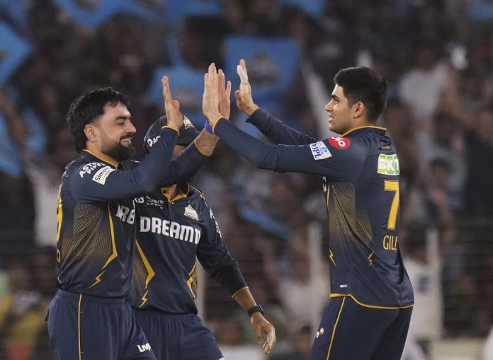 Ahmedabad: Gujarat Titans’ Rashid Khan celebrates with teammates after taking the wicket of Rajasthan Royals’ Dhruv Jurel during an Indian Premier League (IPL) 2025 T20 cricket match between Gujarat Titans and Rajasthan Royals, at the Narendra Modi Stadium, in Ahmedabad, Wednesday, April 9, 2025. (PTI Photo/Arun Sharma) (PTI04_09_2025_000567B)