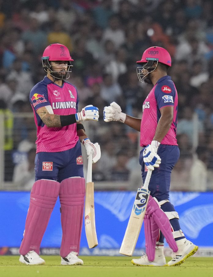 Ahmedabad: Rajasthan Royals’ captain Sanju Samson and Riyan Parag during an Indian Premier League (IPL) 2025 T20 cricket match between Gujarat Titans and Rajasthan Royals, at the Narendra Modi Stadium, in Ahmedabad, Wednesday, April 9, 2025. (PTI Photo/Arun Sharma) (PTI04_09_2025_000560B)