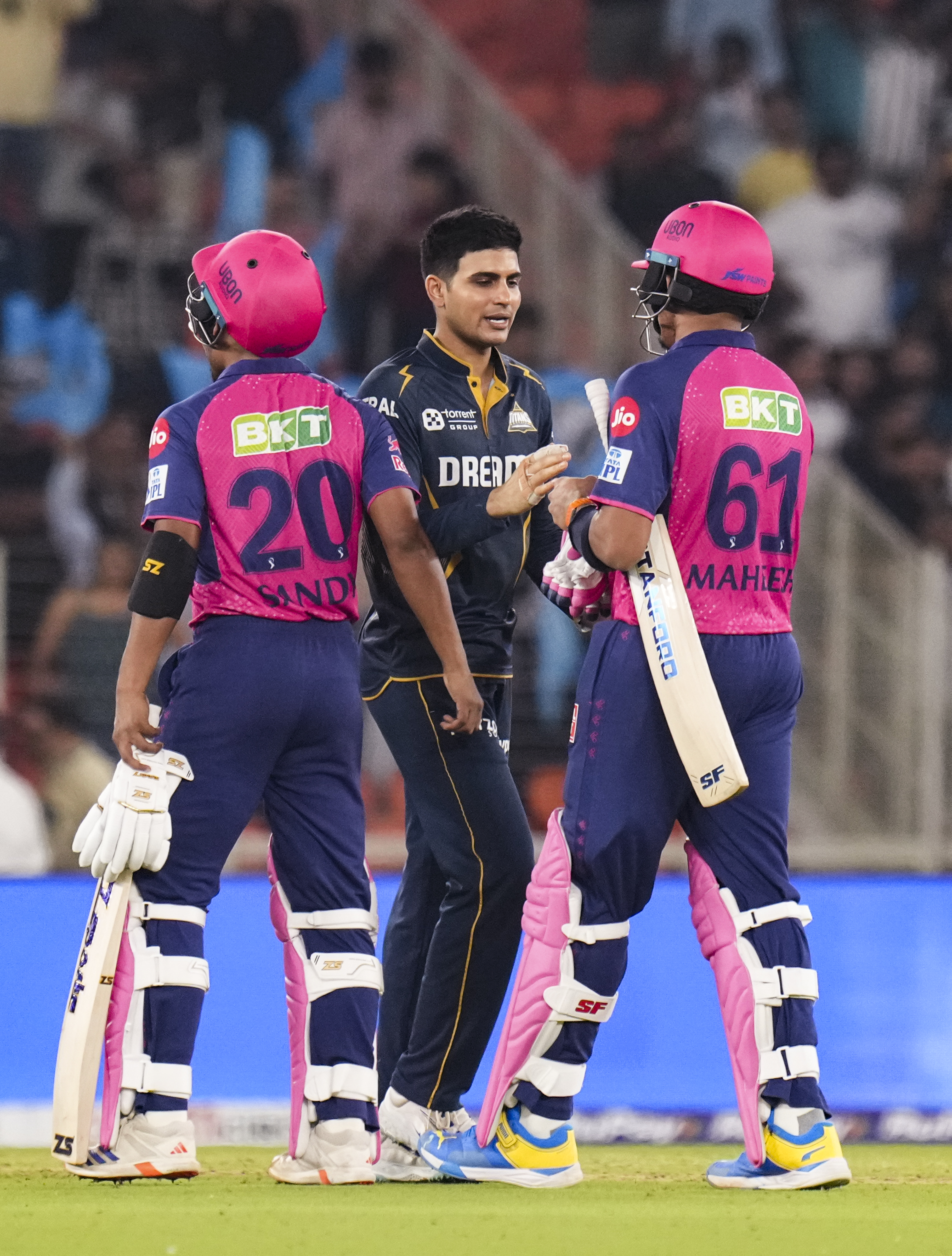 Ahmedabad: Gujarat Titans’ captain Shubman Gill being congratulated by Rajasthan Royals’ players after winning the Indian Premier League (IPL) 2025 T20 cricket match between Gujarat Titans and Rajasthan Royals, at the Narendra Modi Stadium, in Ahmedabad, Wednesday, April 9, 2025. (PTI Photo/Arun Sharma) (PTI04_09_2025_000627B)