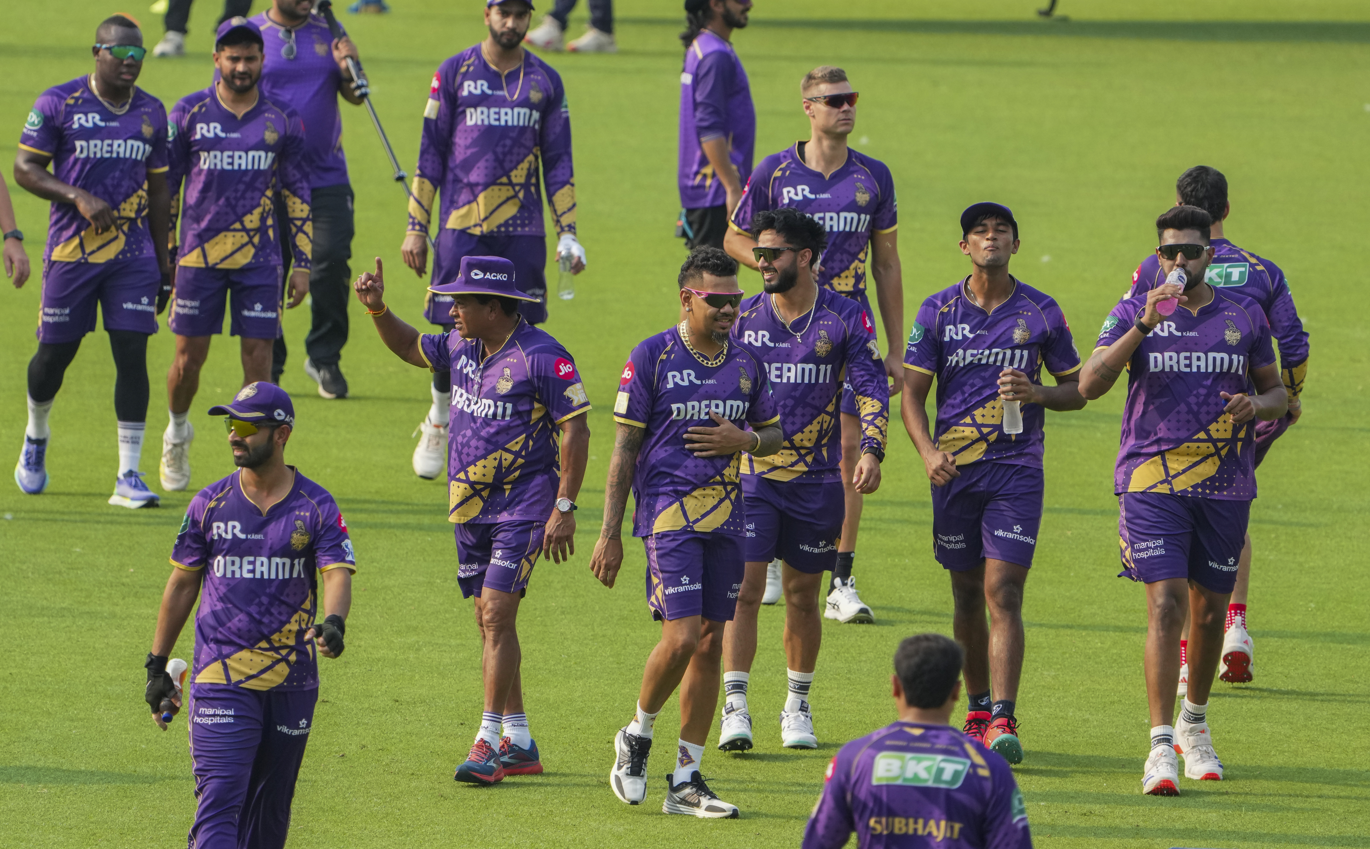 Kolkata: Kolkata Knight Riders' players during a practice session ahead of the Indian Premier League (IPL) 2025 cricket match between Kolkata Knight Riders and Lucknow Super Giants, at the Eden Gardens stadium, in Kolkata, West Bengal, Sunday, April 6, 2025. (PTI Photo/Swapan Mahapatra) (PTI04_06_2025_000313B)