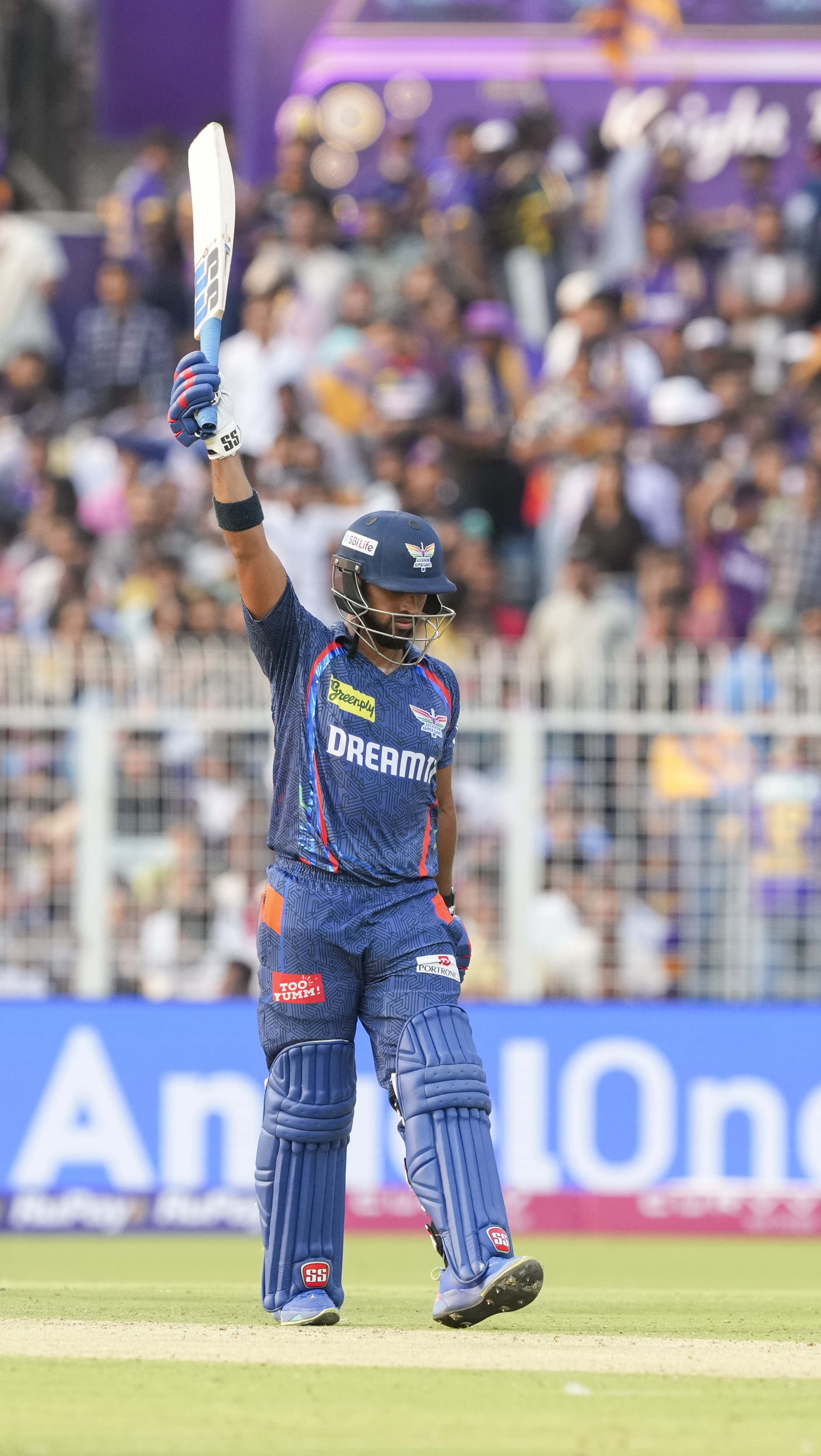 Kolkata: Lucknow Super Giants’ batter Nicholas Pooran celebrates his half century during the Indian Premier League (IPL) 2025 cricket match between Kolkata Knight Riders and Lucknow Super Giants, at Eden Gardens, in Kolkata, West Bengal, Tuesday, April 8, 2025. (PTI Photo/Swapan Mahapatra)(PTI04_08_2025_000289B)