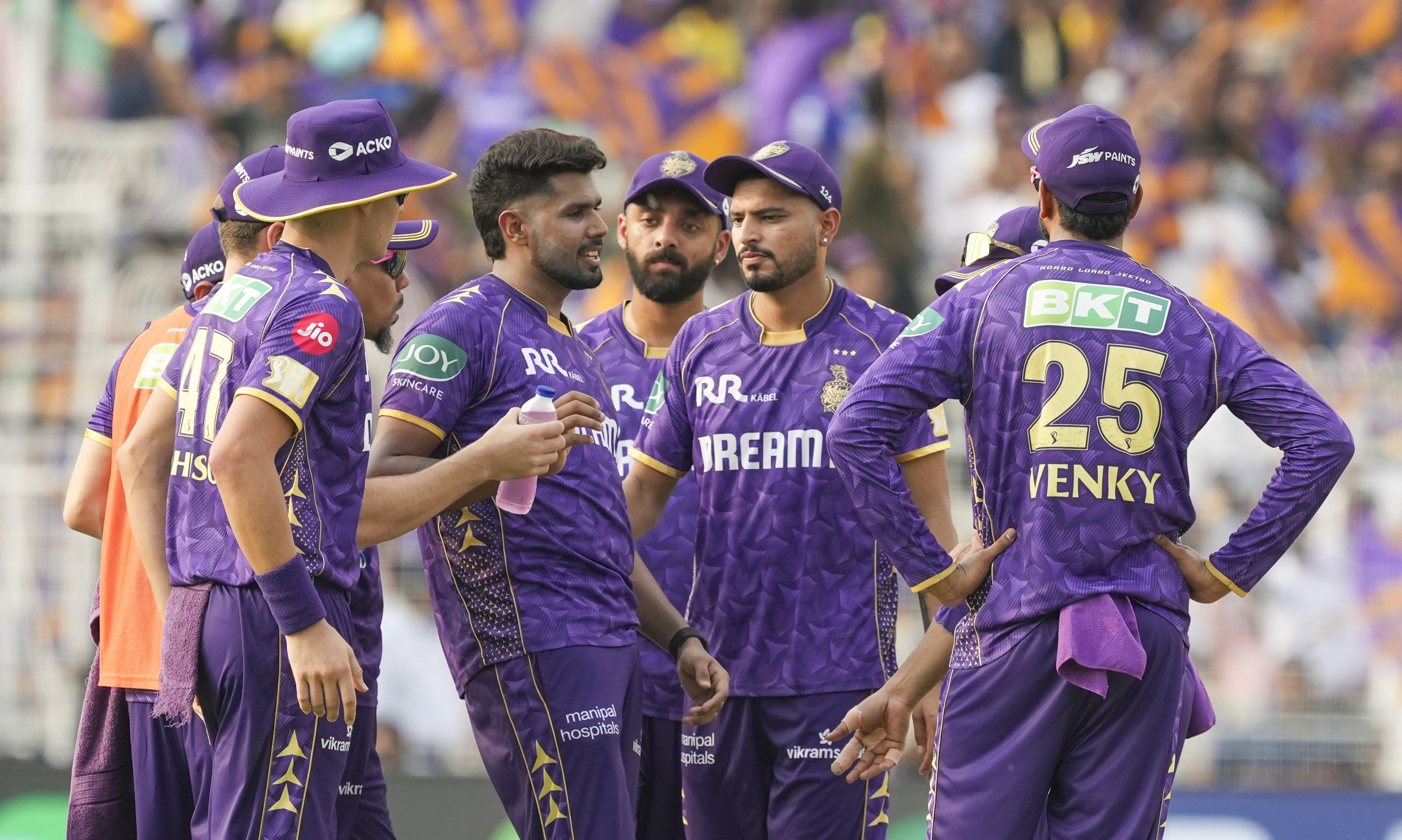 Kolkata: Kolkata Knight Riders’ bowler Harshit Rana celebrates with teammates after the wicket of Lucknow Super Giants’ batter Aiden Markram during the Indian Premier League (IPL) 2025 cricket match between Kolkata Knight Riders and Lucknow Super Giants, at Eden Gardens, in Kolkata, West Bengal, Tuesday, April 8, 2025. (PTI Photo/Swapan Mahapatra)(PTI04_08_2025_000255B)