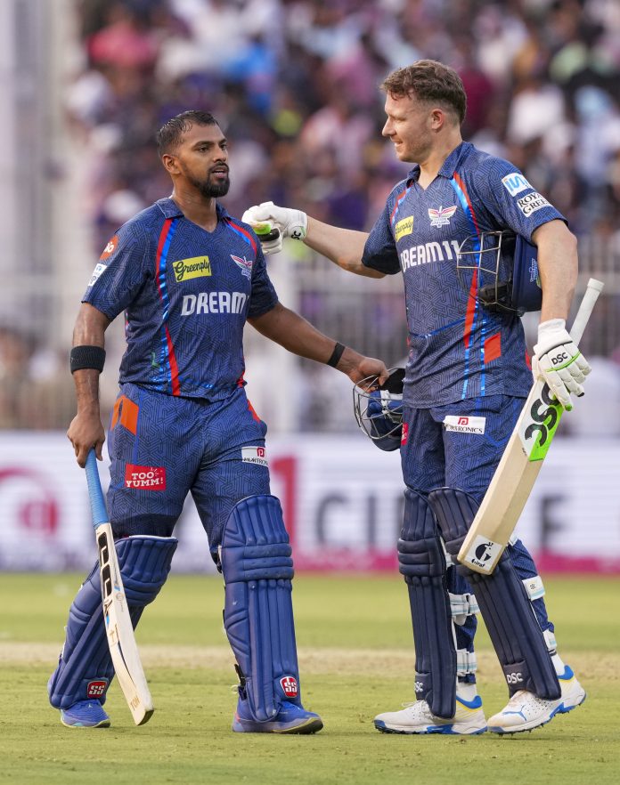 Kolkata: Lucknow Super Giants’ batters Nicholas Pooran and David Miller walk off the field at the end of Lucknow’s innnings during the Indian Premier League (IPL) 2025 cricket match between Kolkata Knight Riders and Lucknow Super Giants, at Eden Gardens, in Kolkata, West Bengal, Tuesday, April 8, 2025. (PTI Photo/Swapan Mahapatra)(PTI04_08_2025_000337B)
