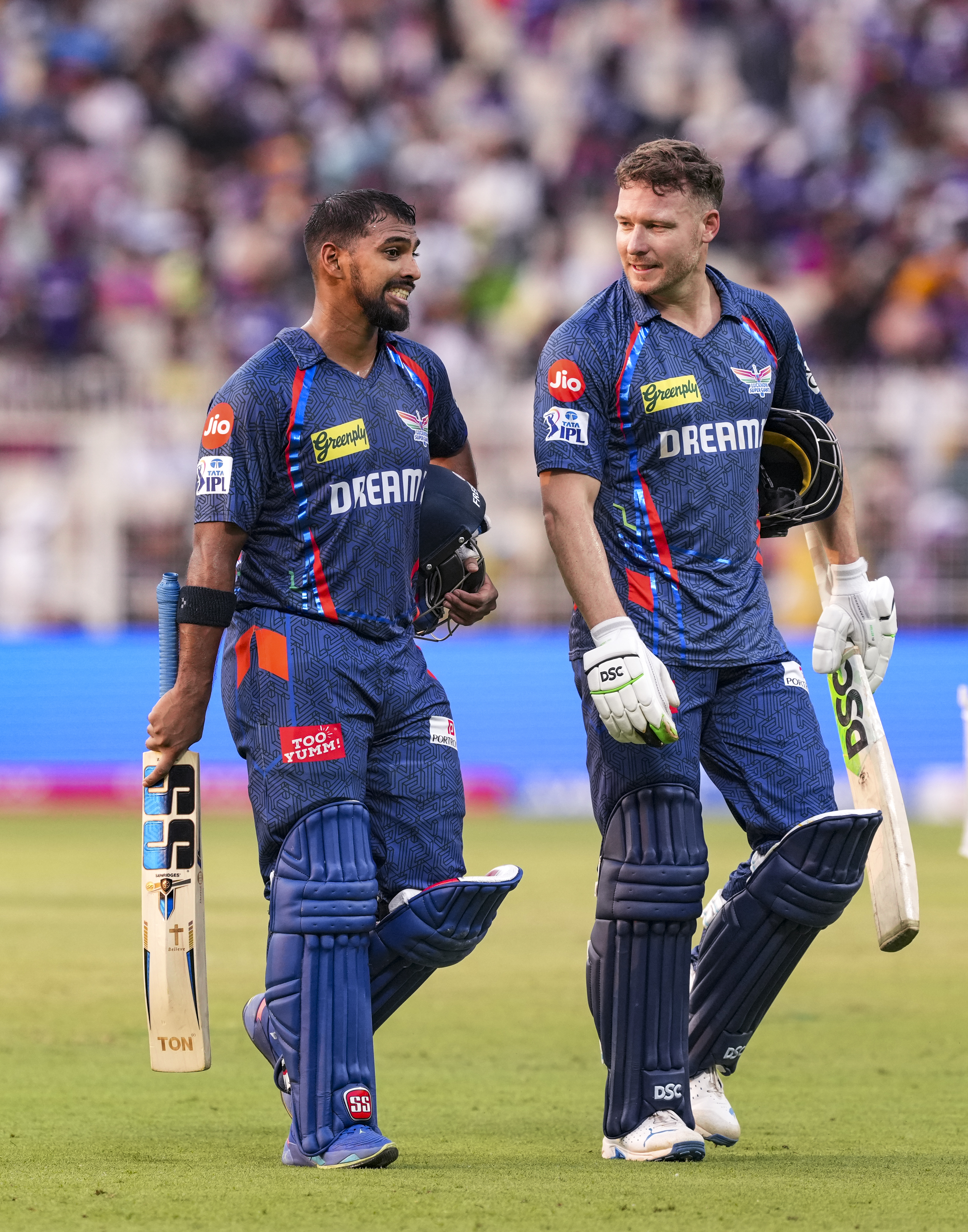 Kolkata: Lucknow Super Giants’ batters Nicholas Pooran and David Miller walk off the field at the end of Lucknow’s innnings during the Indian Premier League (IPL) 2025 cricket match between Kolkata Knight Riders and Lucknow Super Giants, at Eden Gardens, in Kolkata, West Bengal, Tuesday, April 8, 2025. (PTI Photo/Swapan Mahapatra)(PTI04_08_2025_000338B)