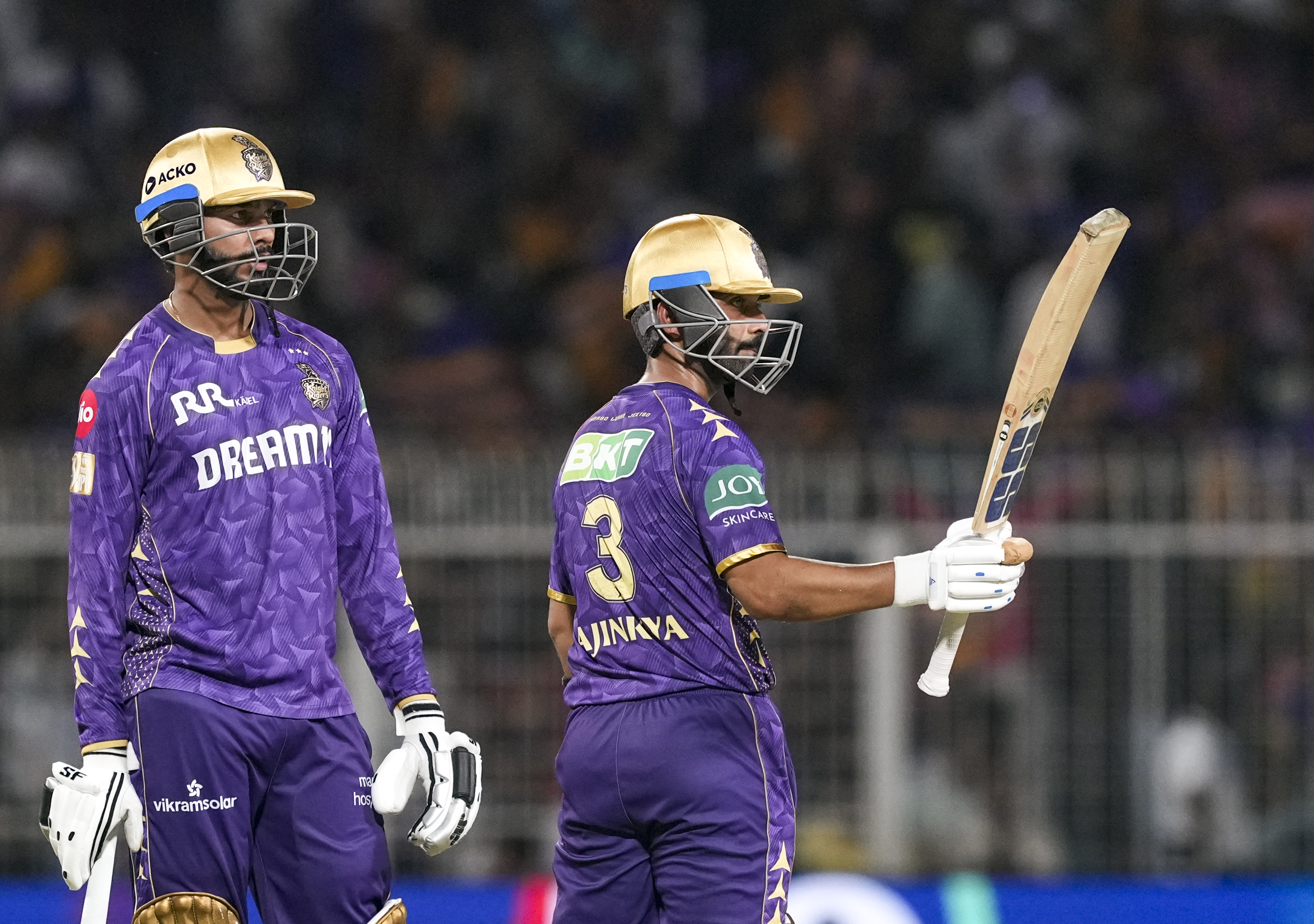 Kolkata: Kolkata Knight Riders’ batter Ajinkya Rahane celebrates his half century during the Indian Premier League (IPL) 2025 cricket match between Kolkata Knight Riders and Lucknow Super Giants, at Eden Gardens, in Kolkata, West Bengal, Tuesday, April 8, 2025. (PTI Photo/Swapan Mahapatra)(PTI04_08_2025_000388B)