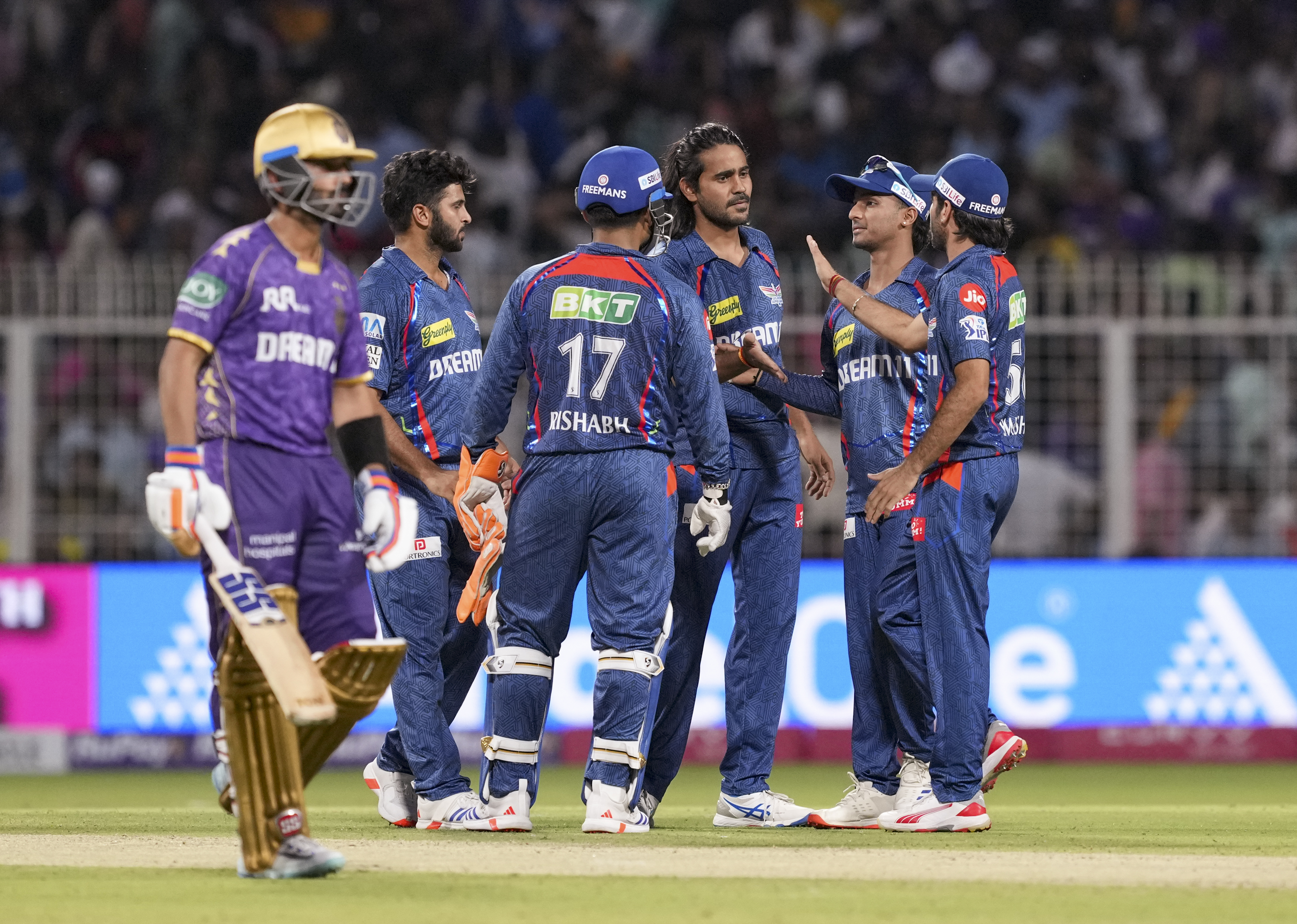 Kolkata: Lucknow Super Giants’ bowler Digvesh Singh celebrates with teammates after the wicket of Kolkata Knight Riders’ batter Sunil Narine during the Indian Premier League (IPL) 2025 cricket match between Kolkata Knight Riders and Lucknow Super Giants, at Eden Gardens, in Kolkata, West Bengal, Tuesday, April 8, 2025. (PTI Photo/Swapan Mahapatra)(PTI04_08_2025_000361B)