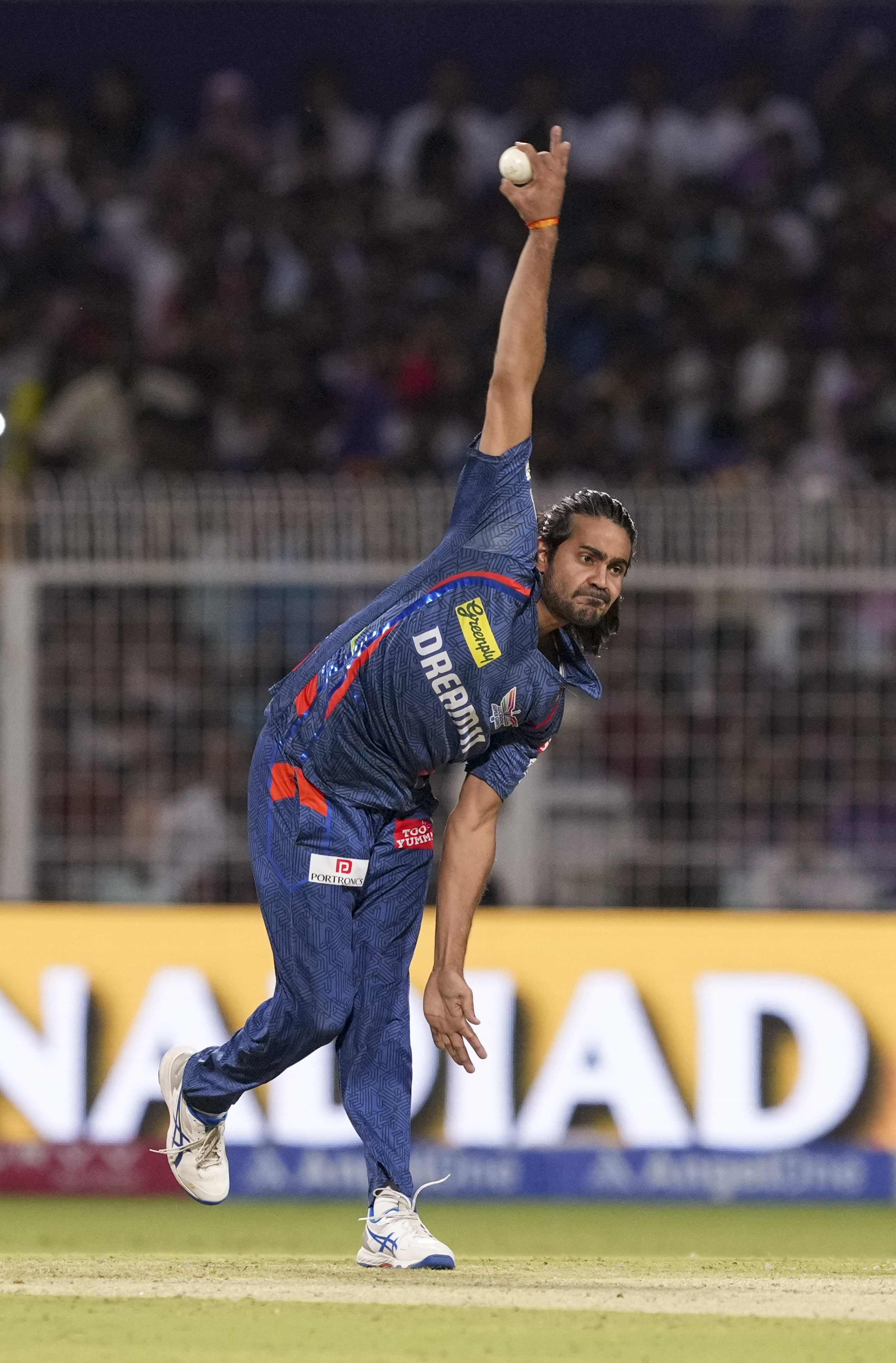 Kolkata: Lucknow Super Giants’ Digvesh Singh bowls during the Indian Premier League (IPL) 2025 cricket match between Kolkata Knight Riders and Lucknow Super Giants, at Eden Gardens, in Kolkata, West Bengal, Tuesday, April 8, 2025. (PTI Photo/Swapan Mahapatra)(PTI04_08_2025_000362B)