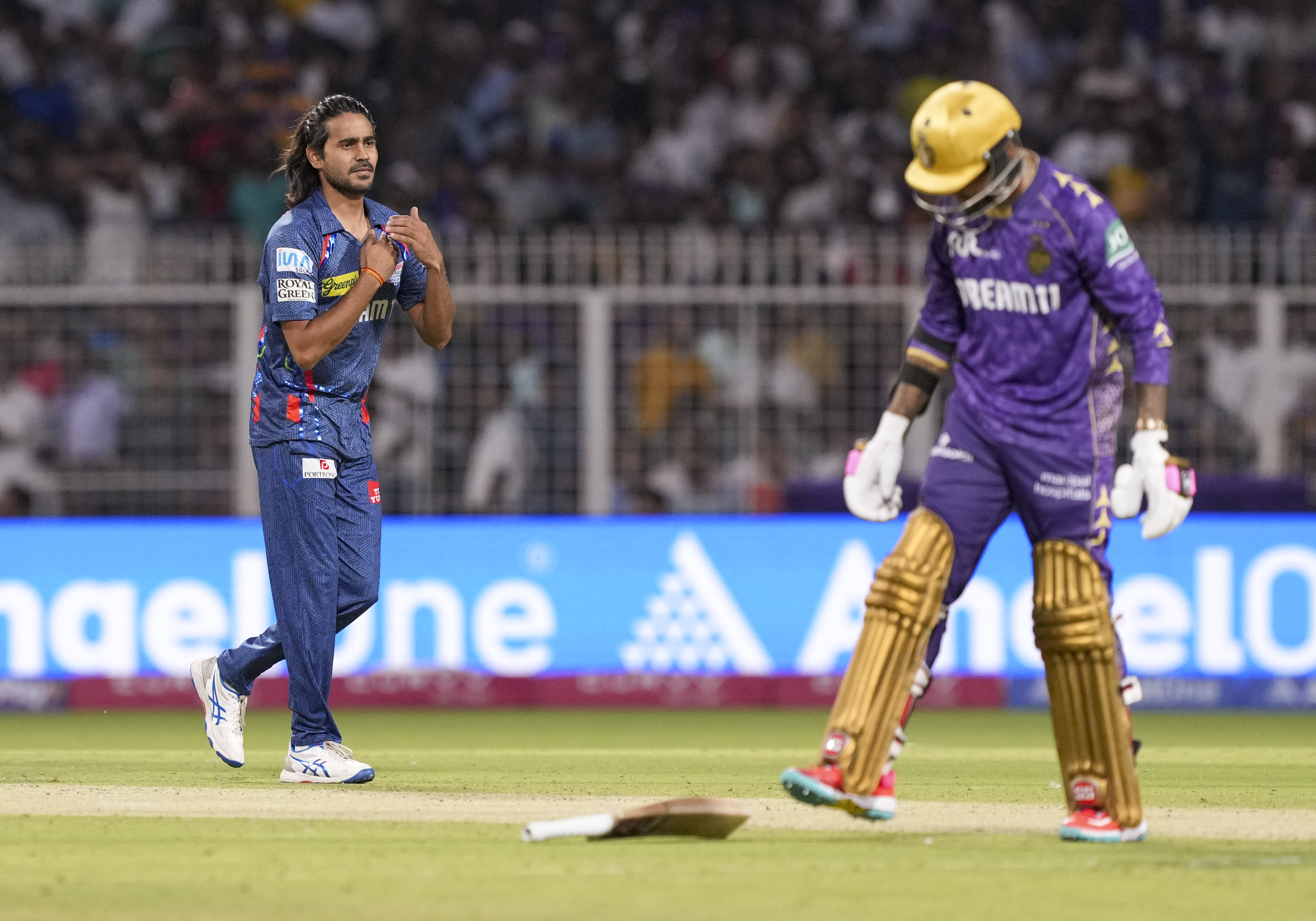 Kolkata: Lucknow Super Giants' bowler Digvesh Singh celebrates the wicket of Kolkata Knight Riders' batter Sunil Narine during the Indian Premier League (IPL) 2025 cricket match between Kolkata Knight Riders and Lucknow Super Giants, at Eden Gardens, in Kolkata, West Bengal, Tuesday, April 8, 2025. (PTI Photo/Swapan Mahapatra)(PTI04_08_2025_000366B)