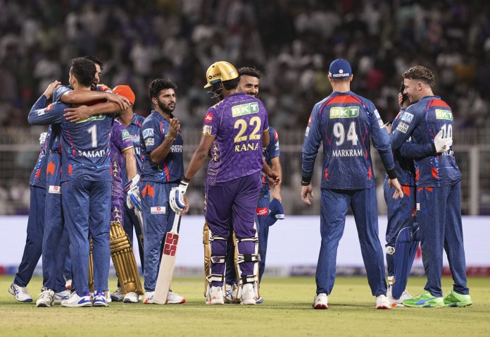Kolkata: Lucknow Super Giants’ players celebrate after winning the Indian Premier League (IPL) 2025 cricket match against Kolkata Knight Riders, at Eden Gardens, in Kolkata, West Bengal, Tuesday, April 8, 2025. (PTI Photo/Swapan Mahapatra)(PTI04_08_2025_000456B)