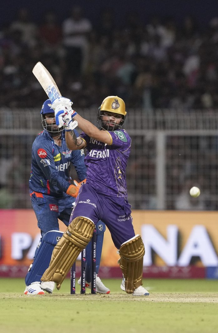 Kolkata: Kolkata Knight Riders’ batter Rinku Singh plays a shot during the Indian Premier League (IPL) 2025 cricket match between Kolkata Knight Riders and Lucknow Super Giants, at Eden Gardens, in Kolkata, West Bengal, Tuesday, April 8, 2025. (PTI Photo/Swapan Mahapatra)(PTI04_08_2025_000444B)