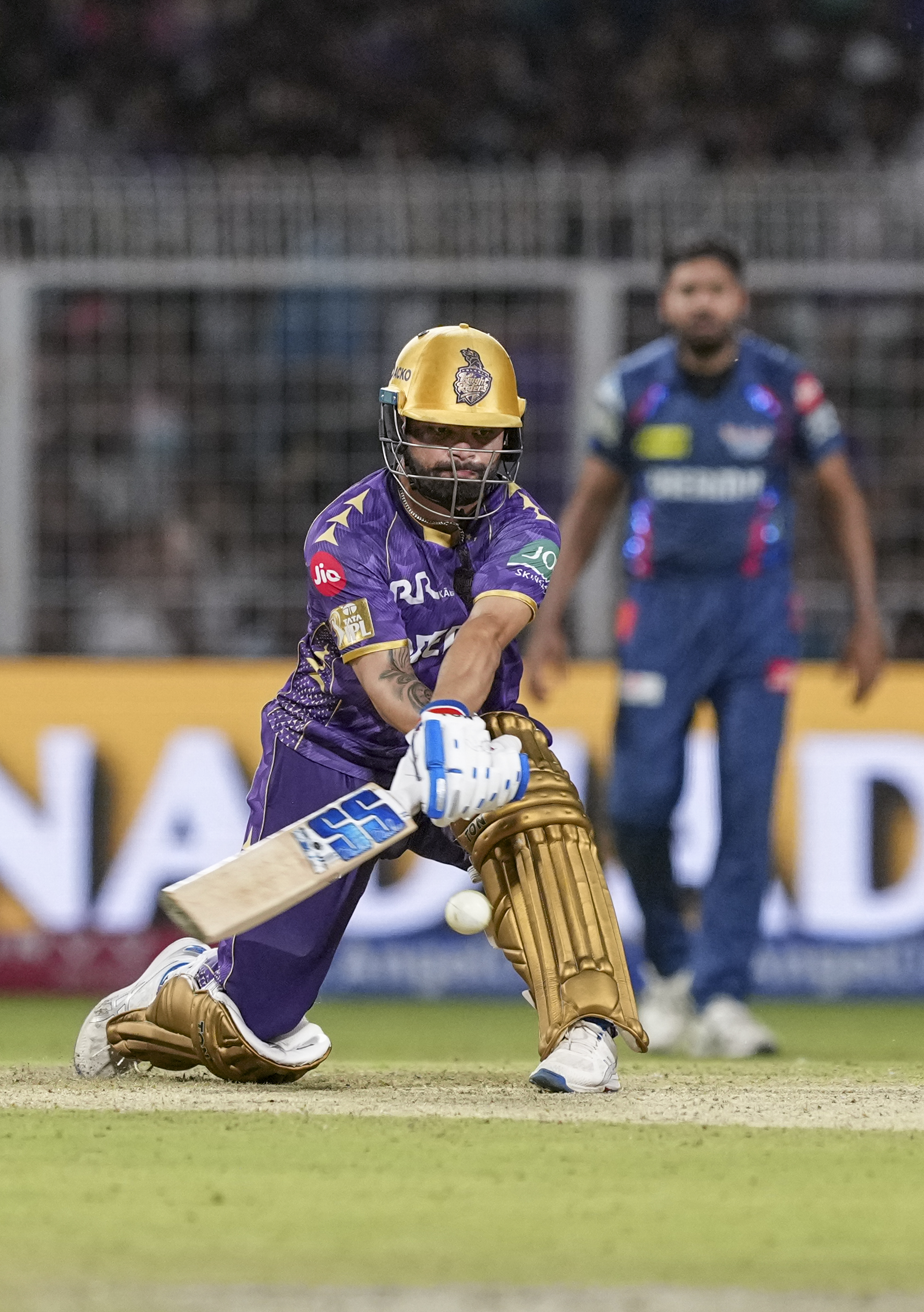 Kolkata: Kolkata Knight Riders’ batter Rinku Singh plays a shot during the Indian Premier League (IPL) 2025 cricket match between Kolkata Knight Riders and Lucknow Super Giants, at Eden Gardens, in Kolkata, West Bengal, Tuesday, April 8, 2025. (PTI Photo/Swapan Mahapatra)(PTI04_08_2025_000436B)
