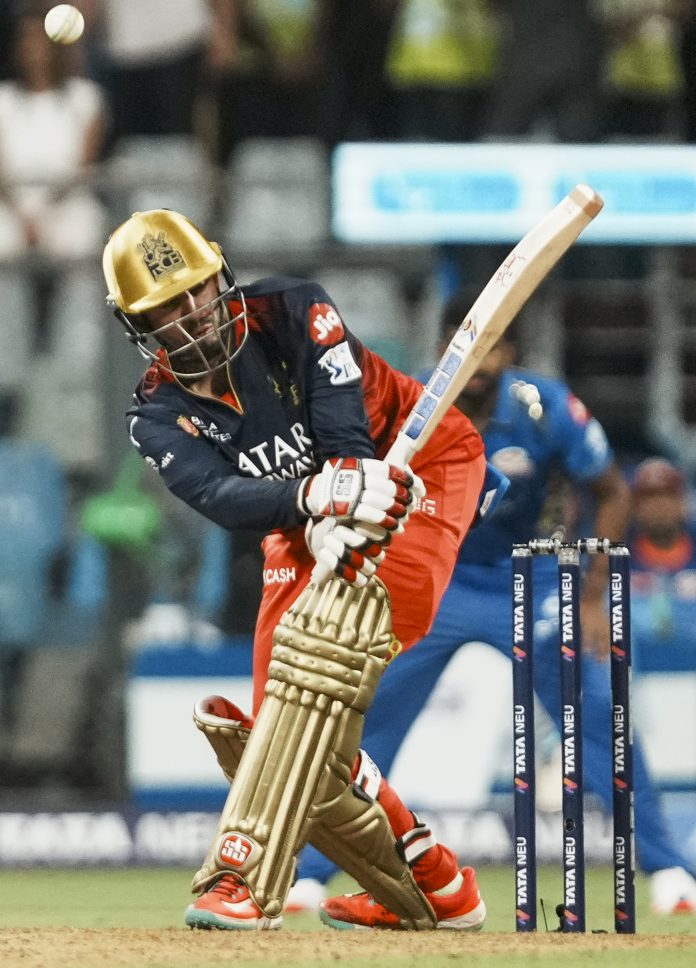 Mumbai: Royal Challengers Bengaluru’s Jitesh Sharma plays a shot during an Indian Premier League (IPL) 2025 cricket match between Mumbai Indians and Royal Challengers Bengaluru, at the Wankhede Stadium in Mumbai, Monday, April 7, 2025. (PTI Photo/Kunal Patil)(PTI04_07_2025_000394B)