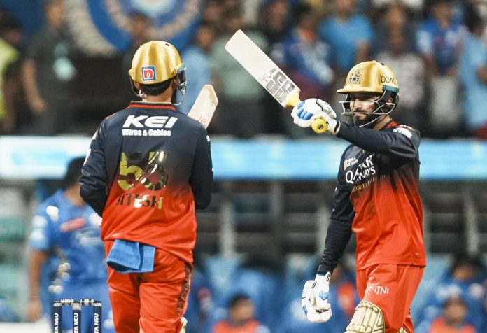 Mumbai: Royal Challengers Bengaluru’s captain Rajat Patidar celebrates his half century during an Indian Premier League (IPL) 2025 cricket match between Mumbai Indians and Royal Challengers Bengaluru, at the Wankhede Stadium in Mumbai, Monday, April 7, 2025. (PTI Photo/Kunal Patil)(PTI04_07_2025_000390B)