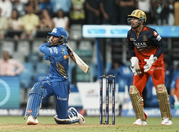 Mumbai: Mumbai Indians’ Tilak Varma plays a shot during an Indian Premier League (IPL) 2025 cricket match between Mumbai Indians and Royal Challengers Bengaluru, at the Wankhede Stadium in Mumbai, Monday, April 7, 2025. (PTI Photo/Kunal Patil)(PTI04_07_2025_000435B)