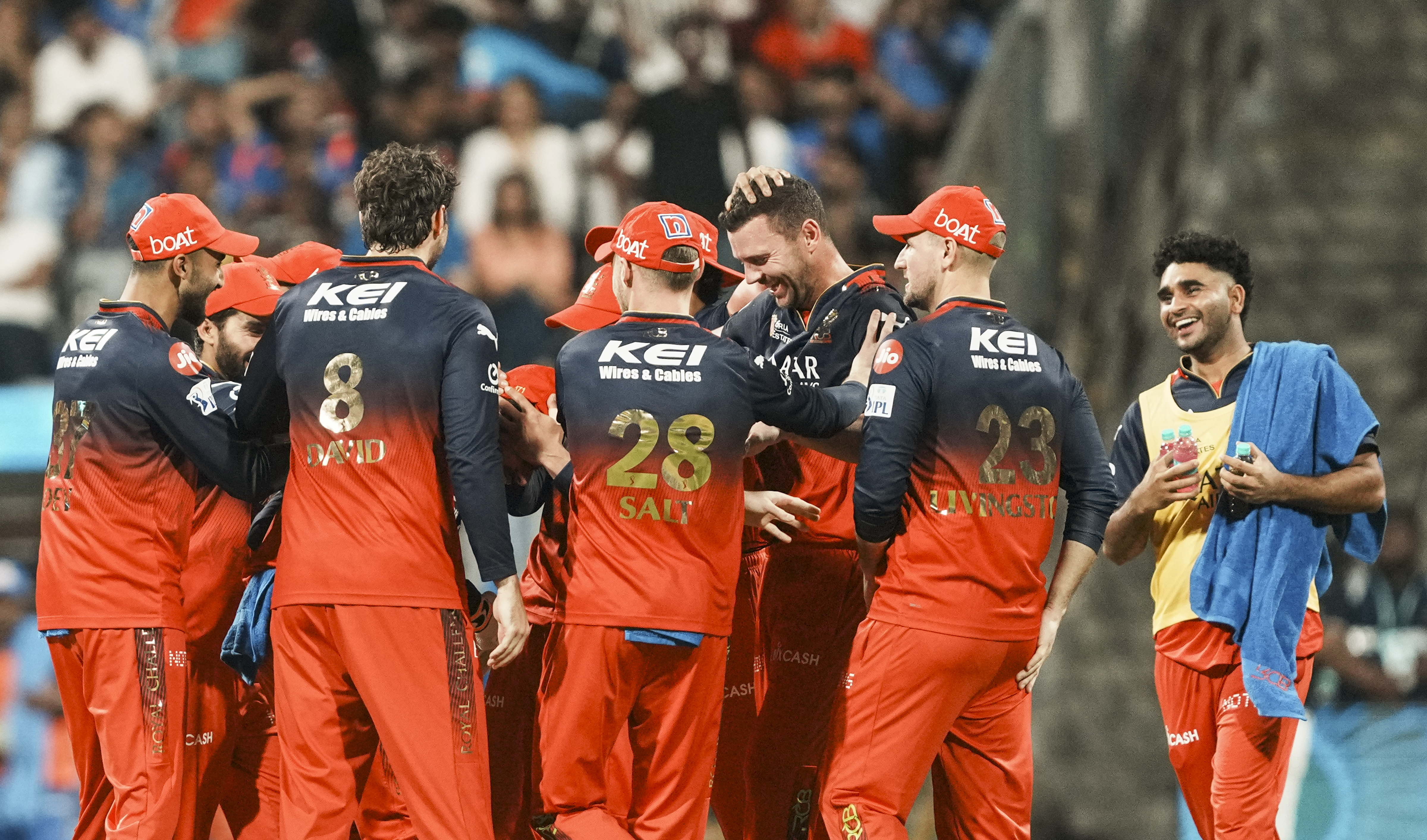 Mumbai: Royal Challengers Bengaluru’s players celebrate the dismissal of Mumbai Indians’ Ryan Rickelton during an Indian Premier League (IPL) 2025 cricket match between Mumbai Indians and Royal Challengers Bengaluru, at the Wankhede Stadium in Mumbai, Monday, April 7, 2025. (PTI Photo/Kunal Patil)(PTI04_07_2025_000419B)