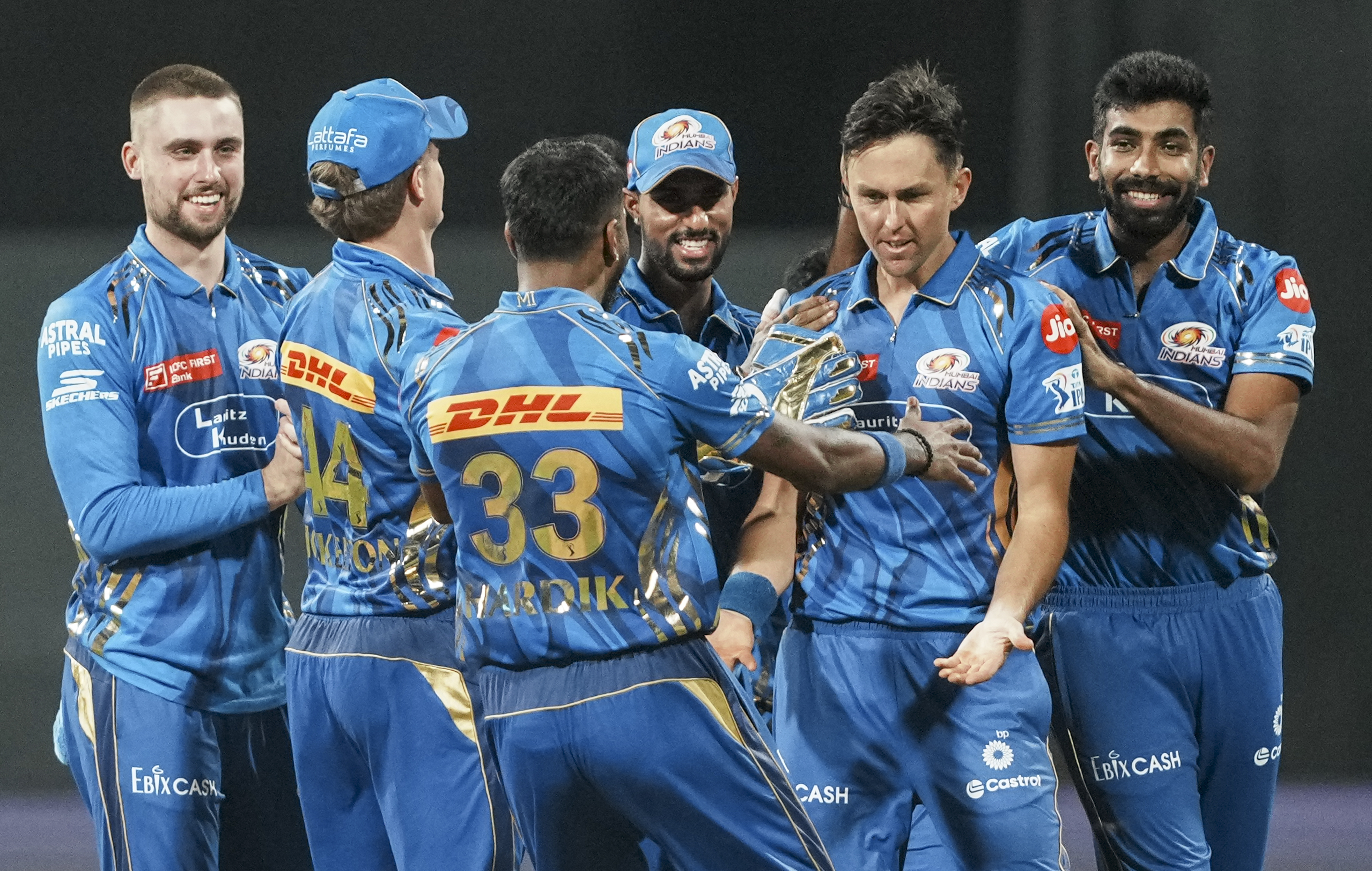 Mumbai: Mumbai Indians’ Trent Boult with teammates celebrates the wicket of Royal Challengers Bengaluru’s Phil Salt during an Indian Premier League (IPL) 2025 cricket match between Mumbai Indians and Royal Challengers Bengaluru, at the Wankhede Stadium in Mumbai, Monday, April 7, 2025. (PTI Photo/Kunal Patil)(PTI04_07_2025_000327B)