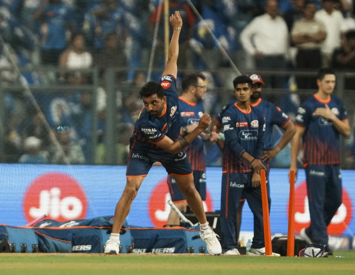 Mumbai: Mumbai Indians’ Deepak Chahar before the start of an Indian Premier League (IPL) 2025 cricket match between Mumbai Indians and Royal Challengers Bengaluru, at the Wankhede Stadium in Mumbai, Monday, April 7, 2025. (PTI Photo/Kunal Patil)(PTI04_07_2025_000309B)
