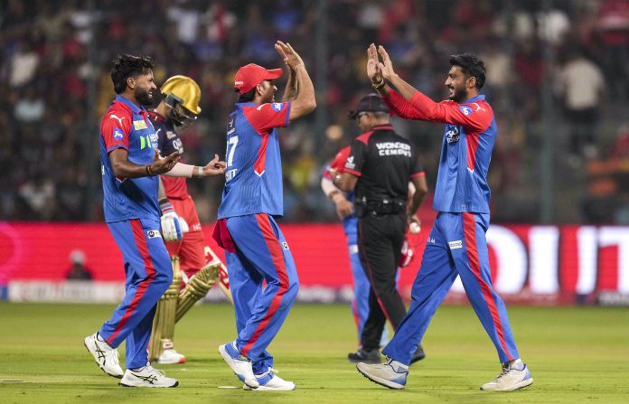 Bengaluru: Delhi Capitals’ Mukesh Kumar celebrates with teammates after taking the wicket of Royal Challengers Bengaluru’s Devdutt Padikkal during an Indian Premier League (IPL) 2025 T20 cricket match between Royal Challengers Bengaluru and Delhi Capitals, at the M Chinnaswamy Stadium, in Bengaluru, Karnataka, Thursday, April 10, 2025. (PTI Photo/Shailendra Bhojak) (PTI04_10_2025_000326B) *** Local Caption ***