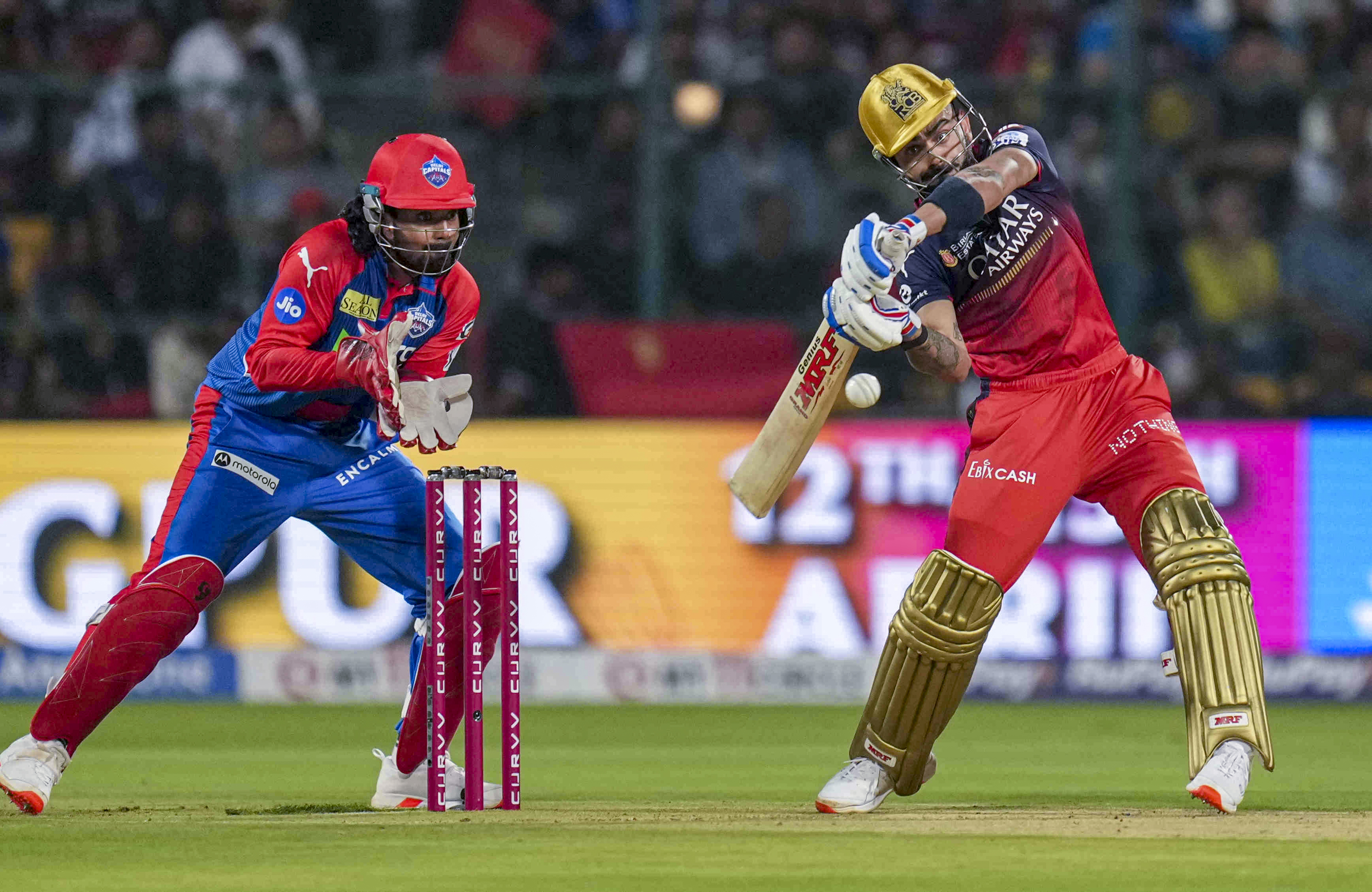 Bengaluru: Royal Challengers Bengaluru’s Virat Kohli plays a shot during an Indian Premier League (IPL) 2025 T20 cricket match between Royal Challengers Bengaluru and Delhi Capitals, at the M Chinnaswamy Stadium, in Bengaluru, Karnataka, Thursday, April 10, 2025. (PTI Photo/Shailendra Bhojak) (PTI04_10_2025_000306B) *** Local Caption ***