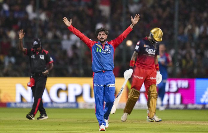 Bengaluru: Delhi Capitals’ Kuldeep Yadav celebrates the wicket of Royal Challengers Bengaluru’s captain Rajat Patidar during an Indian Premier League (IPL) 2025 T20 cricket match between Royal Challengers Bengaluru and Delhi Capitals, at the M Chinnaswamy Stadium, in Bengaluru, Karnataka, Thursday, April 10, 2025. (PTI Photo/Shailendra Bhojak) (PTI04_10_2025_000371B) *** Local Caption ***