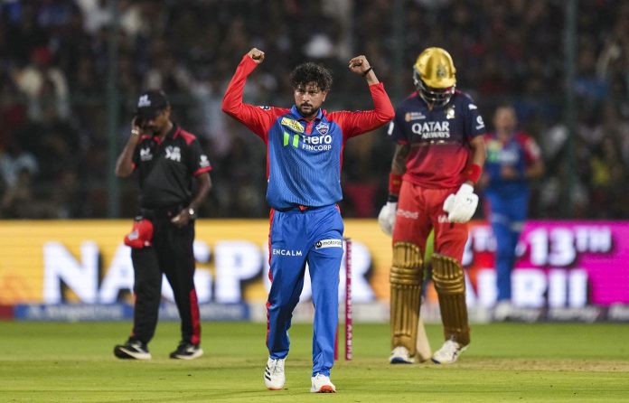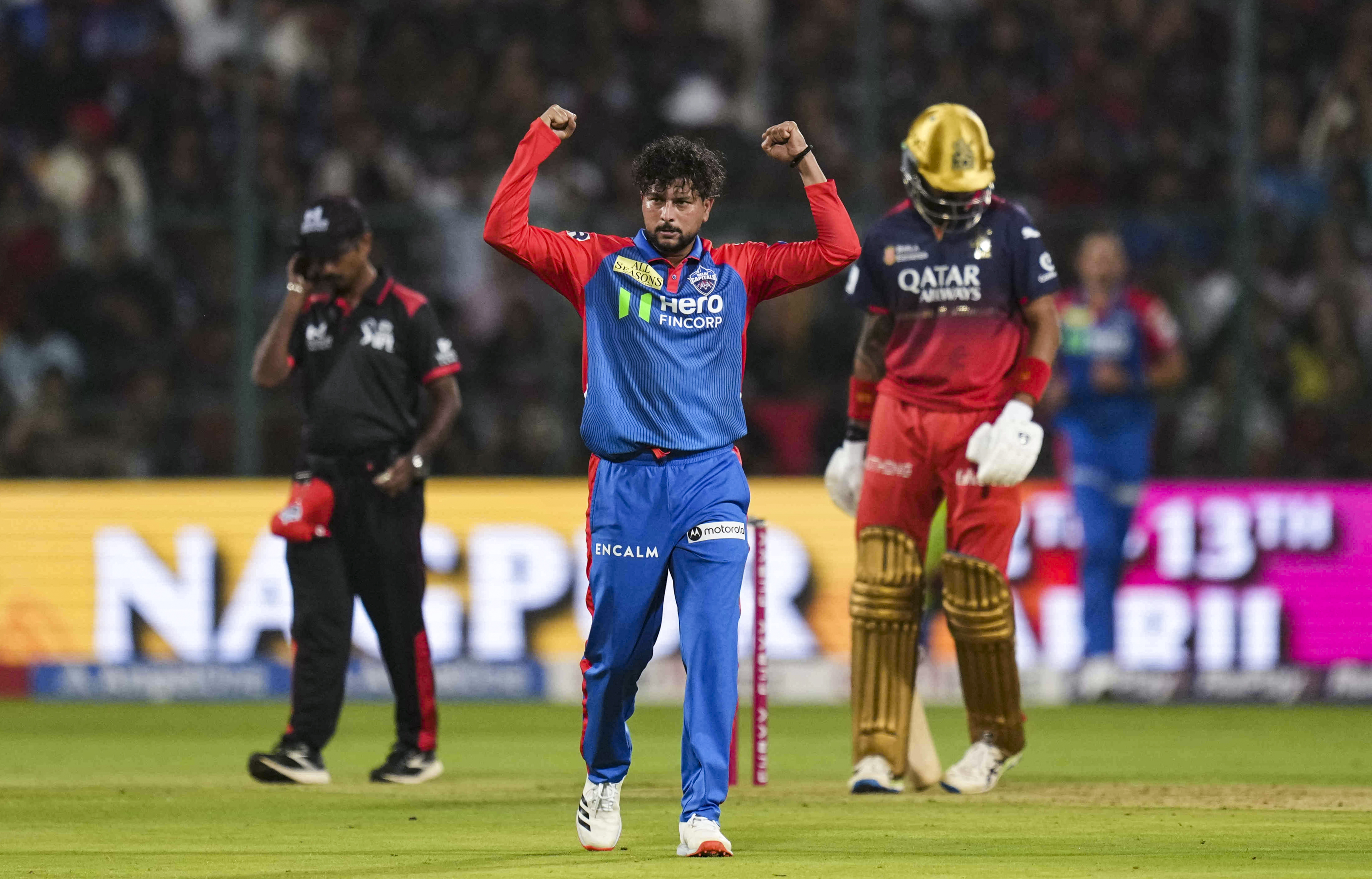 Bengaluru: Delhi Capitals’ Kuldeep Yadav celebrates the wicket of Royal Challengers Bengaluru’s captain Rajat Patidar during an Indian Premier League (IPL) 2025 T20 cricket match between Royal Challengers Bengaluru and Delhi Capitals, at the M Chinnaswamy Stadium, in Bengaluru, Karnataka, Thursday, April 10, 2025. (PTI Photo/Shailendra Bhojak) (PTI04_10_2025_000370B) *** Local Caption ***