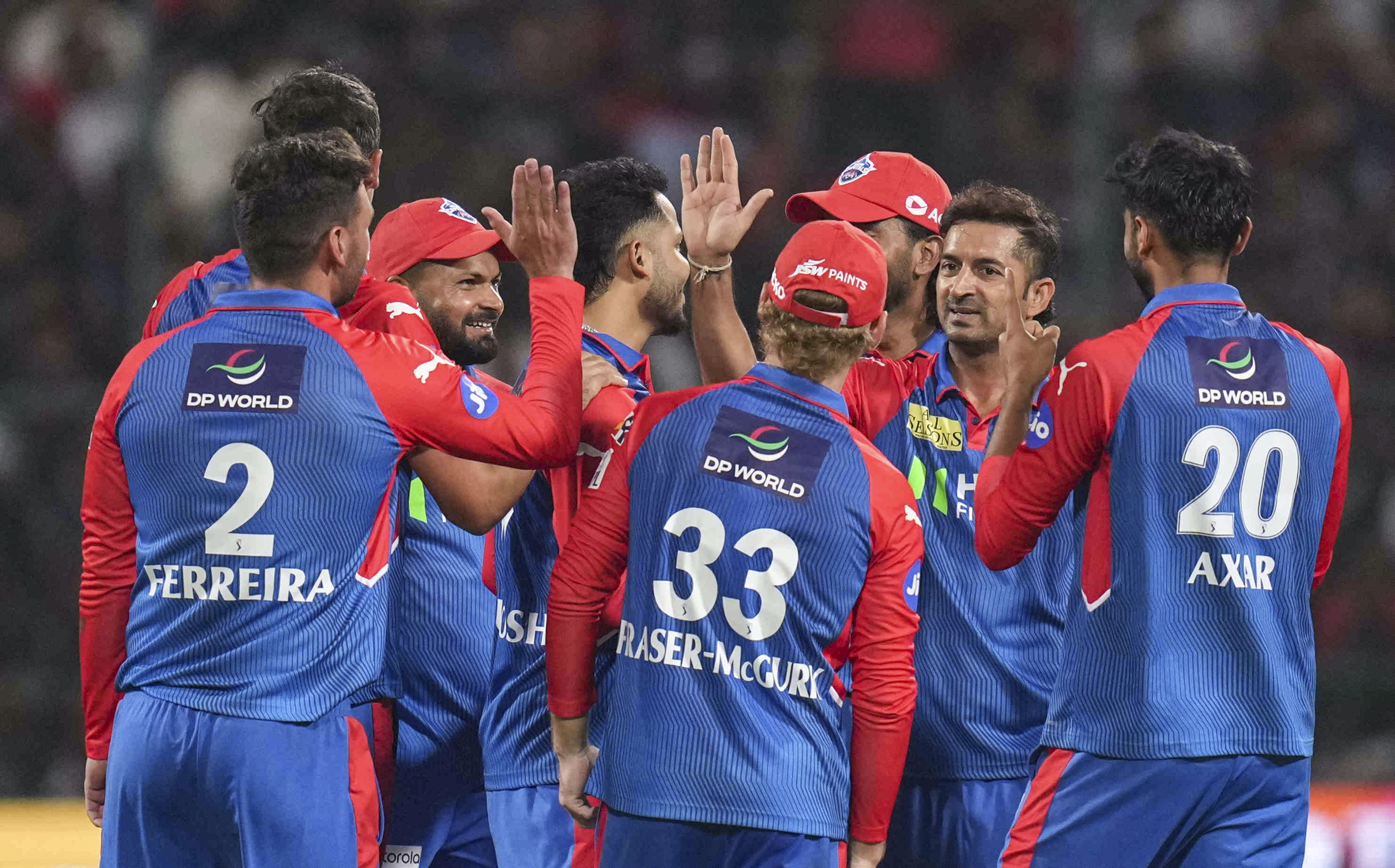 Bengaluru: Delhi Capitals’ Mohit Sharma celebrates with teammates after taking the wicket of Royal Challengers Bengaluru’s Liam Livingstone during an Indian Premier League (IPL) 2025 T20 cricket match between Royal Challengers Bengaluru and Delhi Capitals, at the M Chinnaswamy Stadium, in Bengaluru, Karnataka, Thursday, April 10, 2025. (PTI Photo/Shailendra Bhojak) (PTI04_10_2025_000352B) *** Local Caption ***