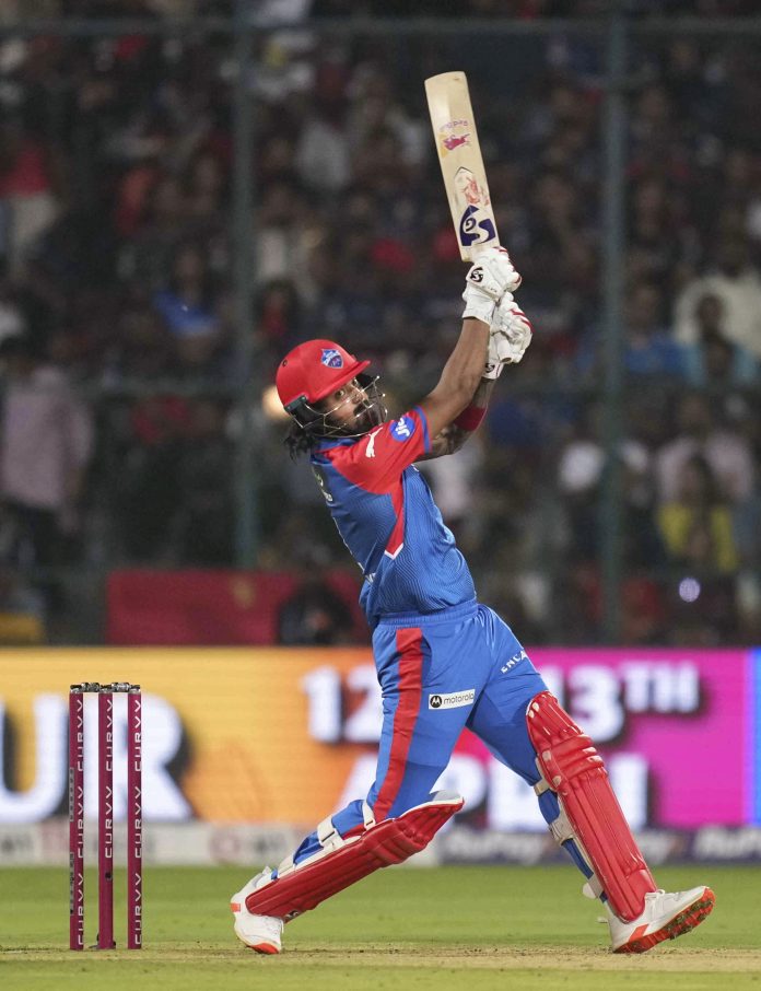 Bengaluru: Delhi Capitals’ KL Rahul plays a shot during an Indian Premier League (IPL) 2025 T20 cricket match between Royal Challengers Bengaluru and Delhi Capitals, at the M Chinnaswamy Stadium, in Bengaluru, Karnataka, Thursday, April 10, 2025. (PTI Photo/Shailendra Bhojak) (PTI04_10_2025_000424B) *** Local Caption ***
