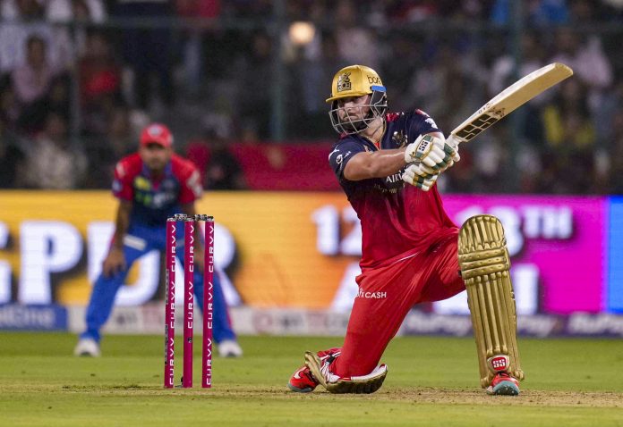 Bengaluru: Royal Challengers Bengaluru’s Tim David plays a shot during an Indian Premier League (IPL) 2025 T20 cricket match between Royal Challengers Bengaluru and Delhi Capitals, at the M Chinnaswamy Stadium, in Bengaluru, Karnataka, Thursday, April 10, 2025. (PTI Photo/Shailendra Bhojak) (PTI04_10_2025_000389B) *** Local Caption ***
