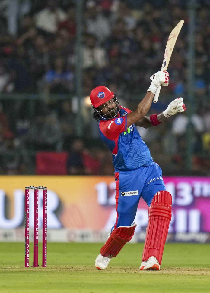Bengaluru: Delhi Capitals’ KL Rahul plays a shot during an Indian Premier League (IPL) 2025 T20 cricket match between Royal Challengers Bengaluru and Delhi Capitals, at the M Chinnaswamy Stadium, in Bengaluru, Karnataka, Thursday, April 10, 2025. (PTI Photo/Shailendra Bhojak) (PTI04_10_2025_000471B) *** Local Caption ***