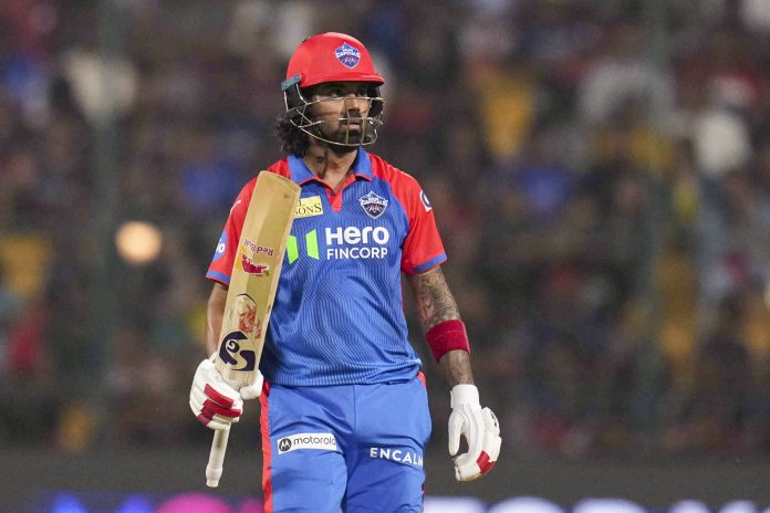 Bengaluru: Delhi Capitals’ KL Rahul celebrates his half century during an Indian Premier League (IPL) 2025 T20 cricket match between Royal Challengers Bengaluru and Delhi Capitals, at the M Chinnaswamy Stadium, in Bengaluru, Karnataka, Thursday, April 10, 2025. (PTI Photo/Shailendra Bhojak) (PTI04_10_2025_000467B) *** Local Caption ***