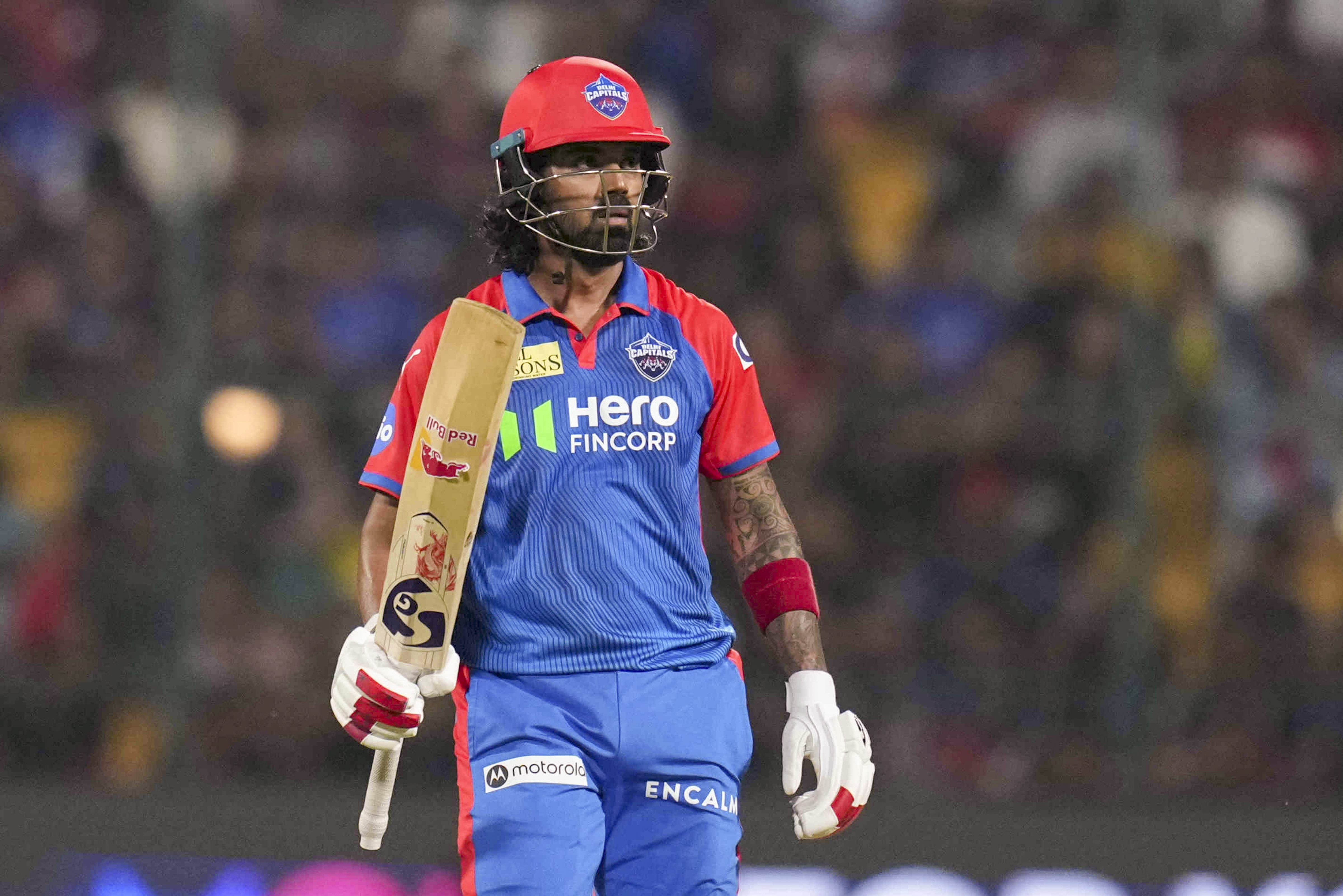 Bengaluru: Delhi Capitals' KL Rahul celebrates his half century during an Indian Premier League (IPL) 2025 T20 cricket match between Royal Challengers Bengaluru and Delhi Capitals, at the M Chinnaswamy Stadium, in Bengaluru, Karnataka, Thursday, April 10, 2025. (PTI Photo/Shailendra Bhojak) (PTI04_10_2025_000467B) *** Local Caption ***