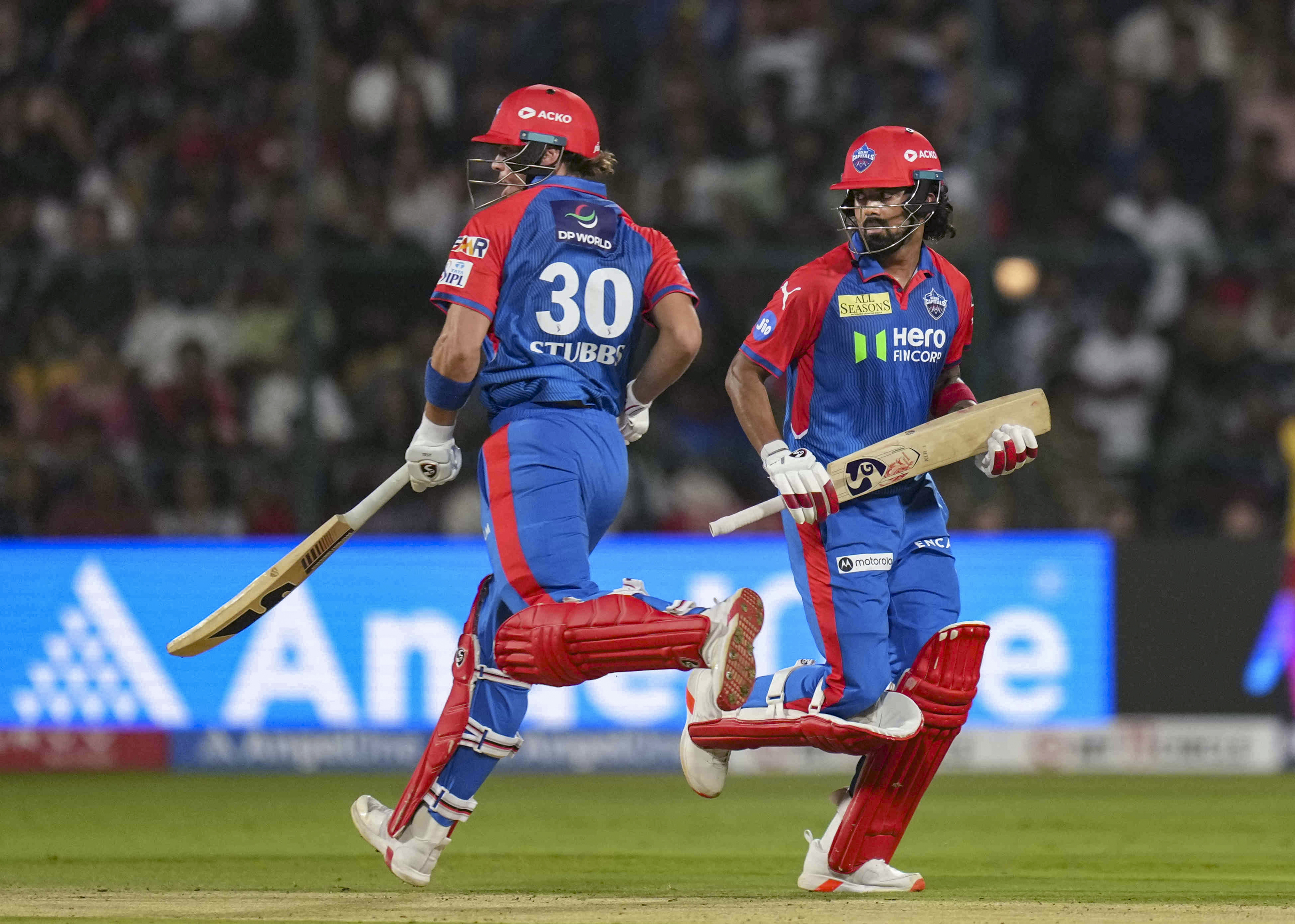 Bengaluru: Delhi Capitals’ KL Rahul and Tristan Stubbs run between the wickets during an Indian Premier League (IPL) 2025 T20 cricket match between Royal Challengers Bengaluru and Delhi Capitals, at the M Chinnaswamy Stadium, in Bengaluru, Karnataka, Thursday, April 10, 2025. (PTI Photo/Shailendra Bhojak) (PTI04_10_2025_000453B) *** Local Caption ***
