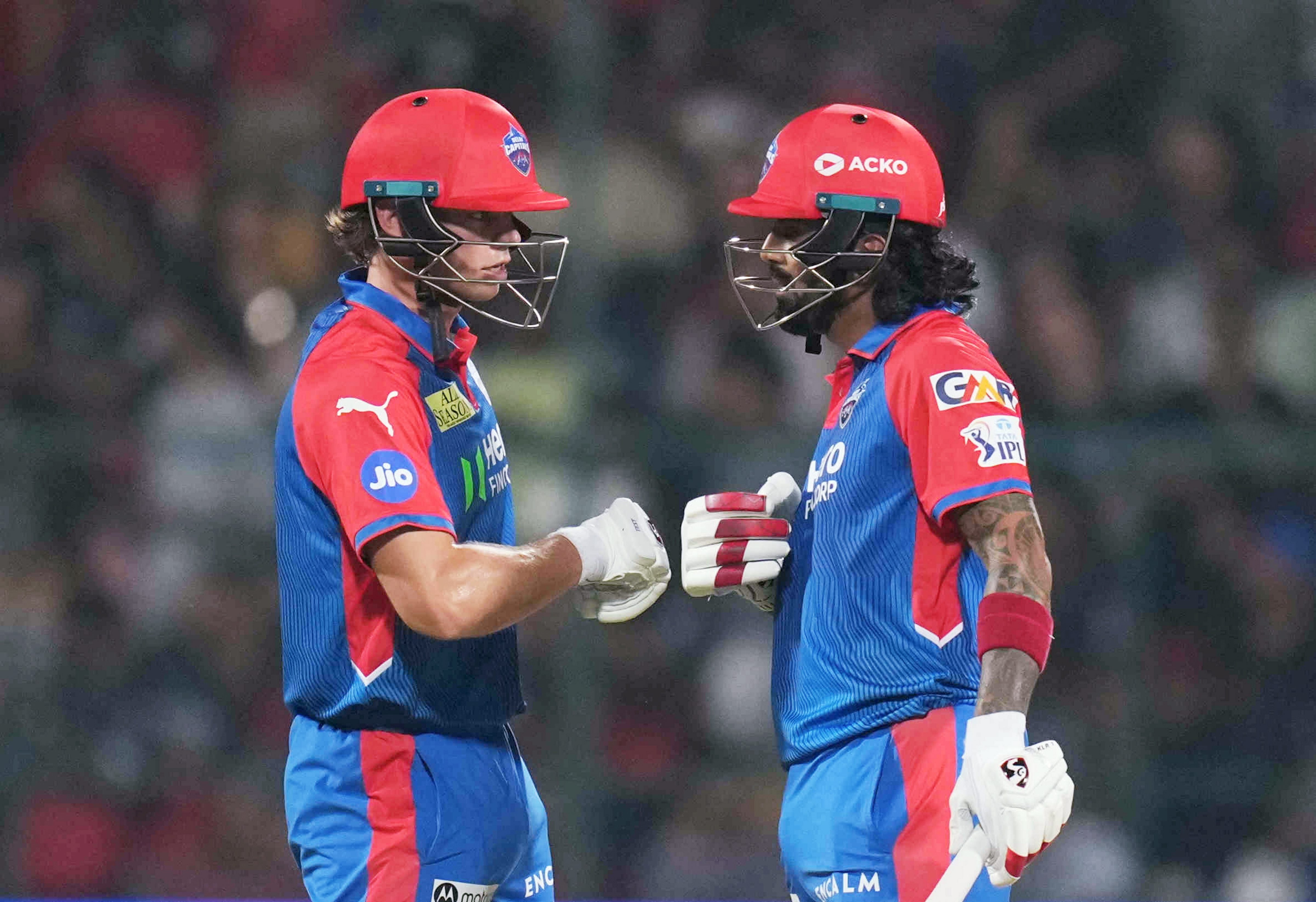 Bengaluru: Delhi Capitals’ KL Rahul and Tristan Stubbs during an Indian Premier League (IPL) 2025 T20 cricket match between Royal Challengers Bengaluru and Delhi Capitals, at the M Chinnaswamy Stadium, in Bengaluru, Karnataka, Thursday, April 10, 2025. (PTI Photo/Shailendra Bhojak) (PTI04_10_2025_000498B) *** Local Caption ***
