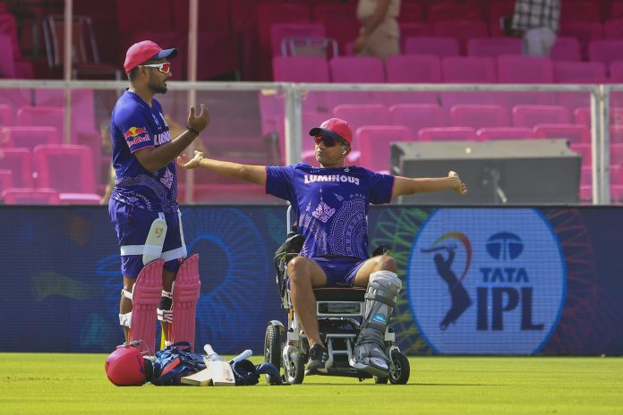Jaipur: Rajasthan Royals captain Sanju Samson and coach Rahul Dravid during a training session ahead of the Indian Premier League (IPL) 2025 match between Rajasthan Royals and Royal Challengers Bengaluru, at Sawai Mansingh Stadium, in Jaipur, Saturday, April 12, 2025. (PTI Photo)(PTI04_12_2025_000218B)