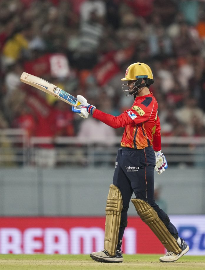 New Chandigarh: Punjab Kings’ Nehal Wadhera celebrates his half century during an Indian Premier League (IPL) 2025 cricket match between Rajasthan Royals and Punjab Kings, in New Chandigarh, Saturday, April 5, 2025. (PTI Photo/Kamal Kishore)(PTI04_05_2025_000525B)