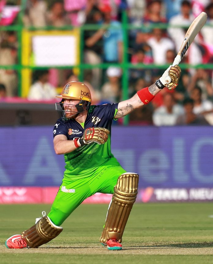 Jaipur: Royal Challengers Bengaluru�s Phil Salt plays a shot during the Indian Premier League (IPL) 2025 T20 cricket match between Rajasthan Royals and Royal Challengers Bengaluru, at Sawai Mansingh Stadium, in Jaipur, Sunday, April 13, 2025. (PTI Photo) (PTI04_13_2025_000257B)
