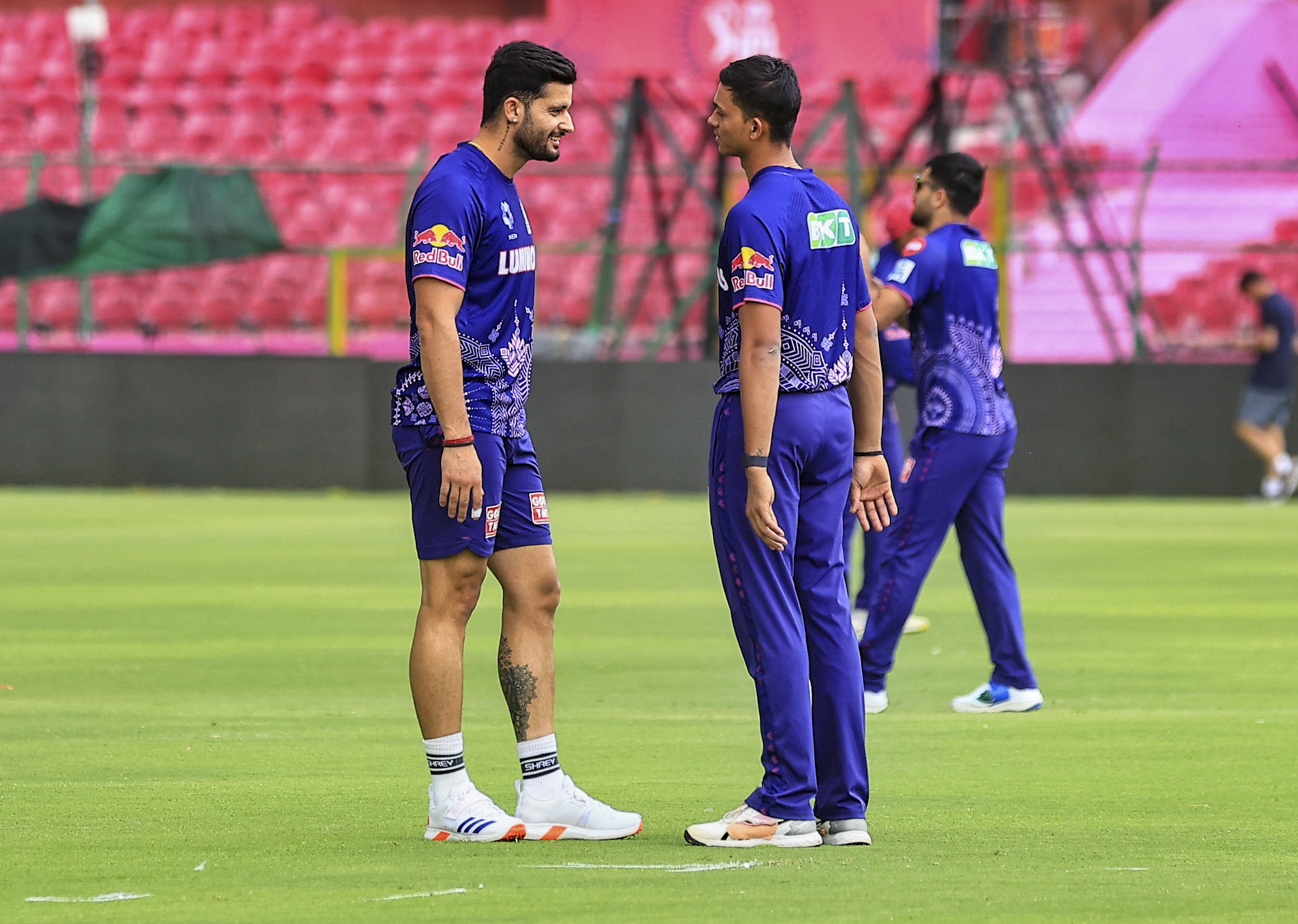 Jaipur: Rajasthan Royals� Yudhvir Singh and Yashasvi Jaiswal during a practice session ahead of an Indian Premier League (IPL) 2025 T20 cricket match between Rajasthan Royals and Royal Challengers Bangaluru, at Sawai Mansingh Stadium, in Jaipur, Friday, April 11, 2025. (PTI Photo) (PTI04_11_2025_000280B) *** Local Caption ***