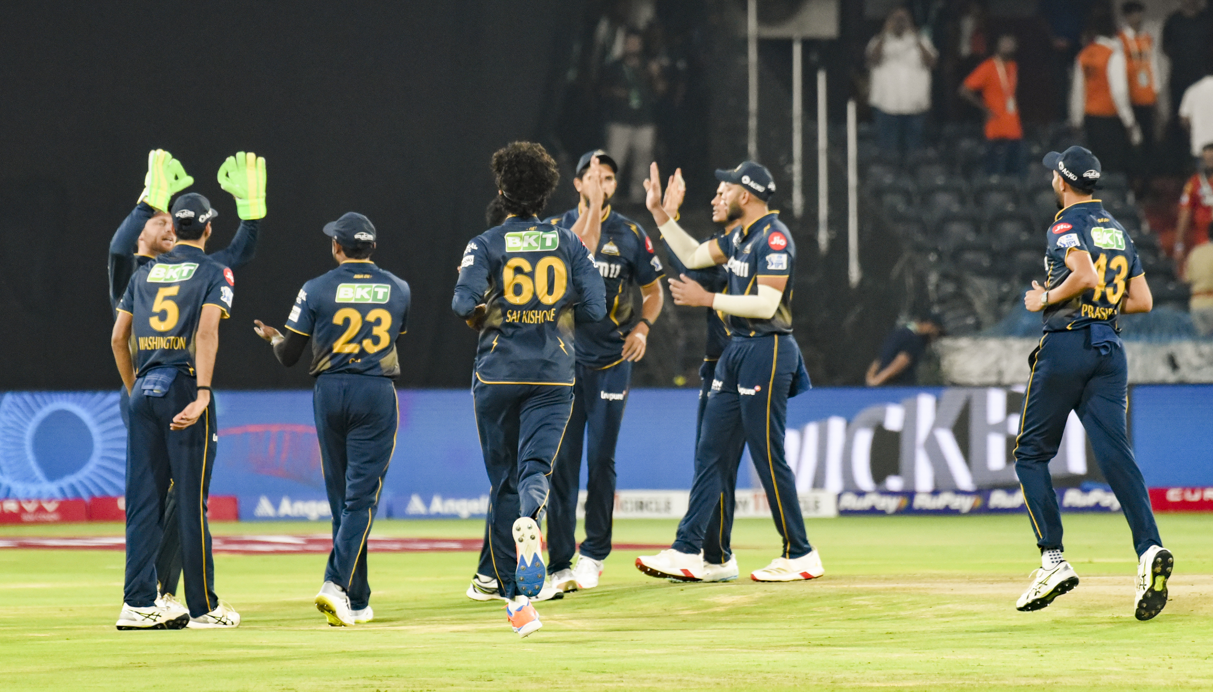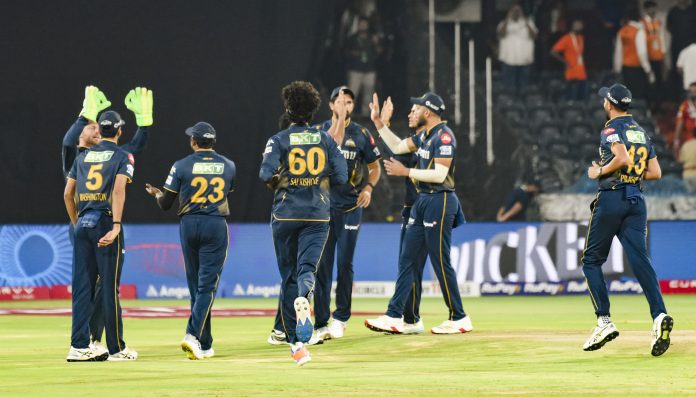 Hyderabad: Gujarat Titans’ players celebrate the wicket of Sunrisers Hyderabad’s batter Travis Head during the Indian Premier League (IPL) 2025 match between Sunrisers Hyderabad and Gujarat Titans, at Rajiv Gandhi International Cricket Stadium, in Hyderabad, Sunday, April 6, 2025. (PTI Photo)(PTI04_06_2025_000346B)