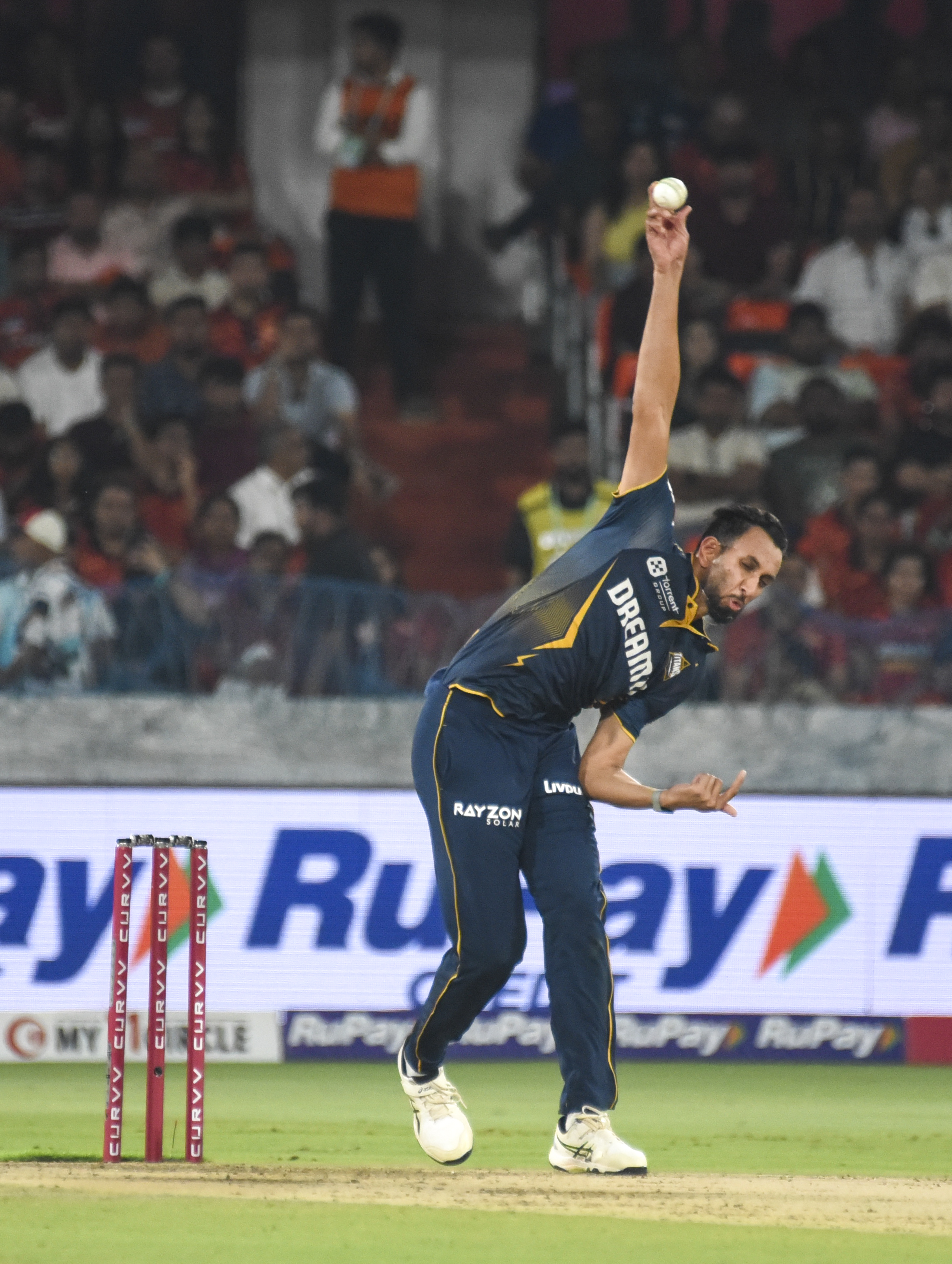 Hyderabad: Gujarat Titans’ Prasidh Krishna bowls during the Indian Premier League (IPL) 2025 match between Sunrisers Hyderabad and Gujarat Titans, at Rajiv Gandhi International Cricket Stadium, in Hyderabad, Sunday, April 6, 2025. (PTI Photo)(PTI04_06_2025_000361B)