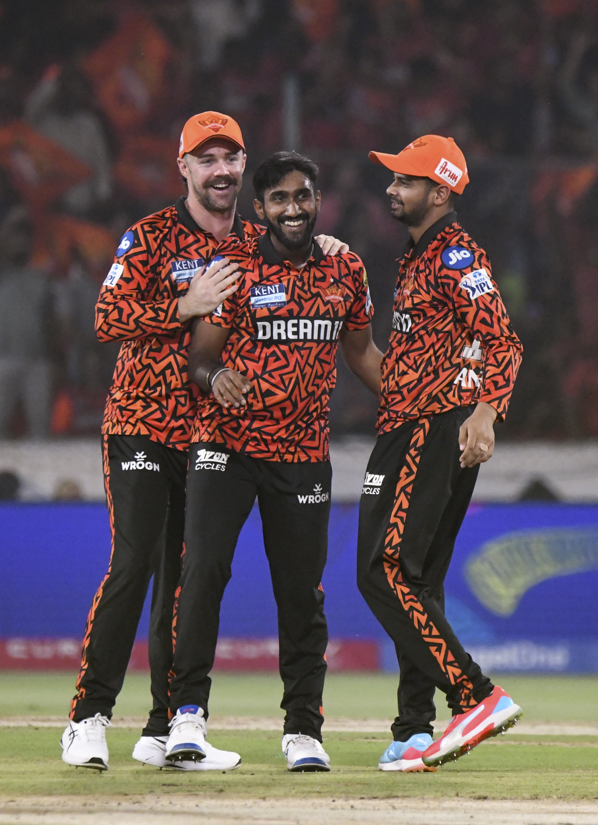Hyderabad: Sunrisers’ Hyderabad’s Eshan Malinga celebrates with teammates after taking the wicket of Punjab Kings’ Prabhmsiran Singh during an Indian Premier League (IPL) 2025 T20 cricket match between Sunrisers Hyderabad and Punjab Kings, at Rajiv Gandhi International Cricket Stadium, Uppal, in Hyderabad, Saturday, April 12, 2025. (PTI Photo) (PTI04_12_2025_000448B)