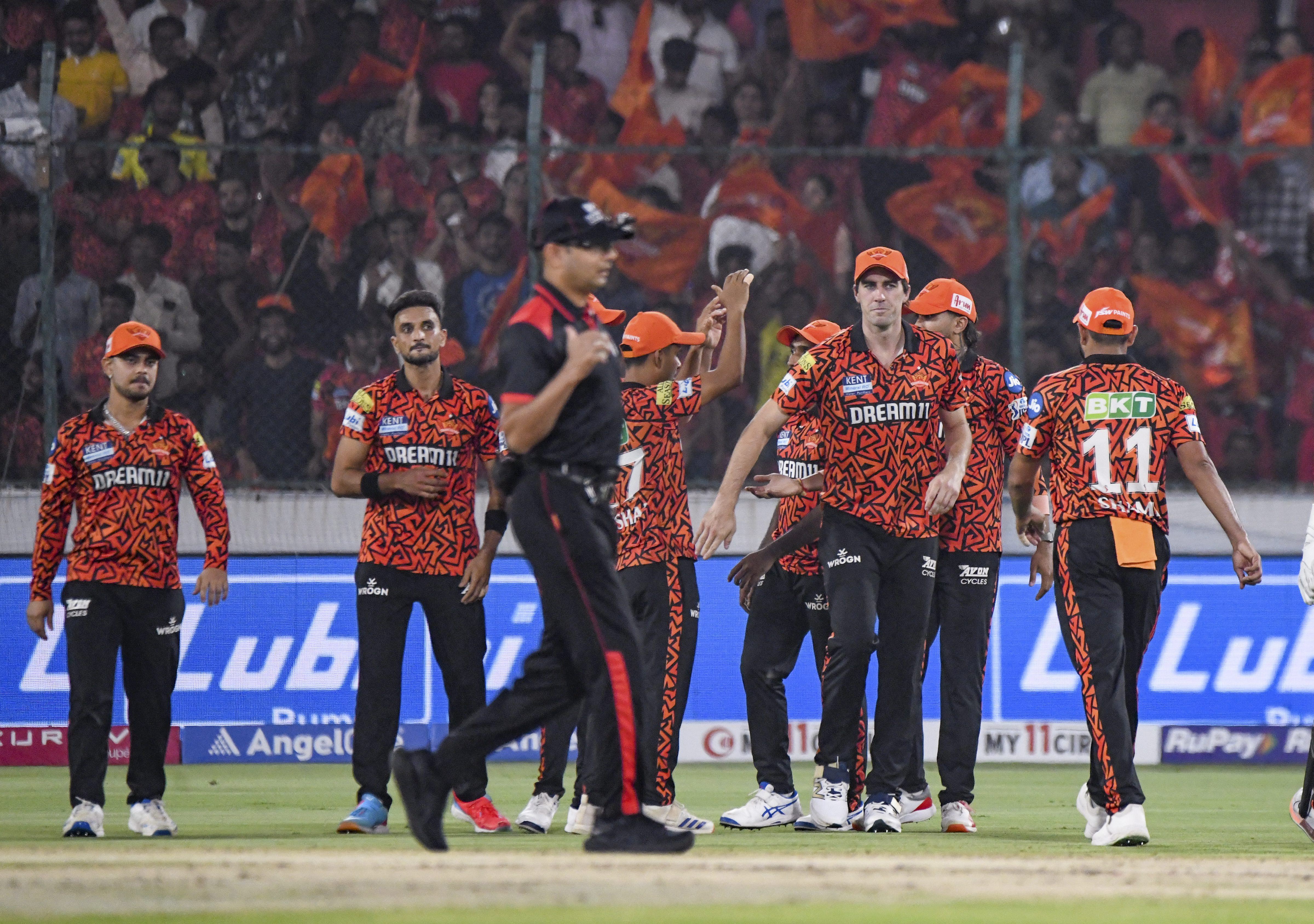 Hyderabad: Sunrisers Hyderabad’s players celebrate the wicket of Punjab Kings’ Priyansh Arya during an Indian Premier League (IPL) 2025 T20 cricket match between Sunrisers Hyderabad and Punjab Kings, at Rajiv Gandhi International Cricket Stadium, Uppal, in Hyderabad, Saturday, April 12, 2025. (PTI Photo) (PTI04_12_2025_000426B)