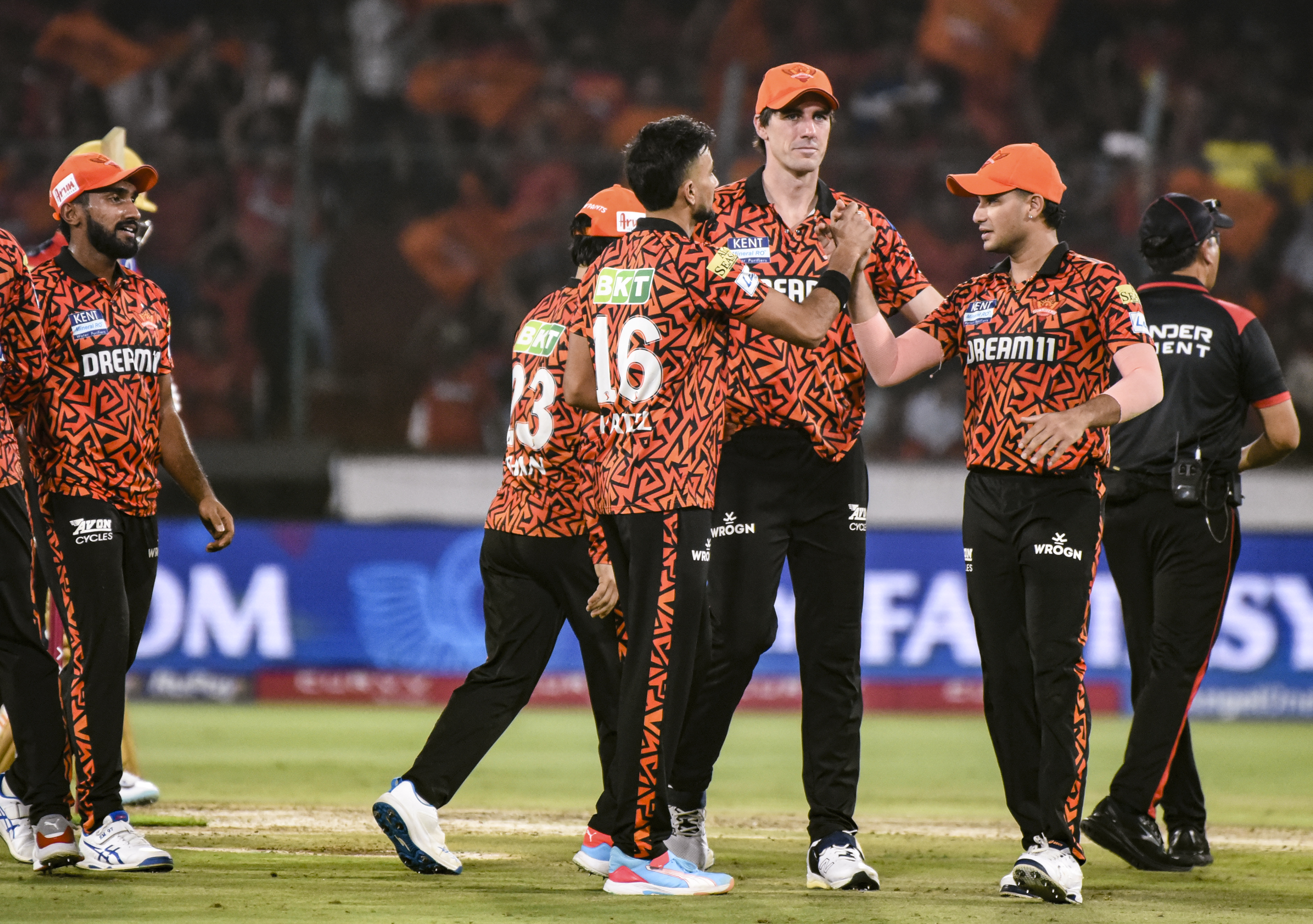 Hyderabad: Sunrisers Hyderabad's players celebrate the wicket of Punjab Kings' Shashank Singh during an Indian Premier League (IPL) 2025 T20 cricket match between Sunrisers Hyderabad and Punjab Kings, at Rajiv Gandhi International Cricket Stadium, Uppal, in Hyderabad, Saturday, April 12, 2025. (PTI Photo) (PTI04_12_2025_000507B)