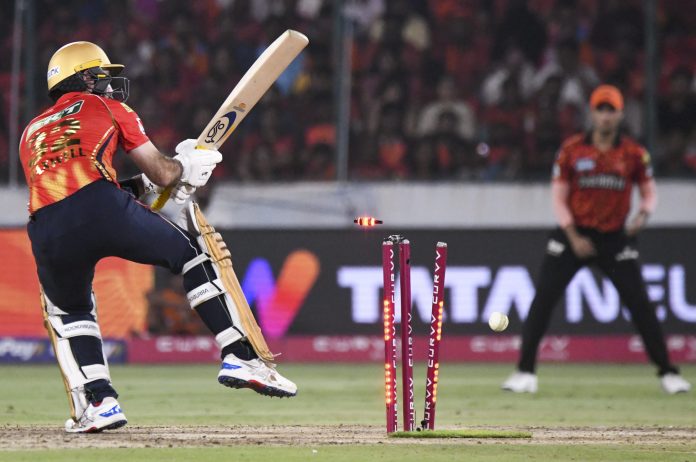 Hyderabad: Punjab Kings’ Glenn Maxwell being bowled by Sunrisers Hyderabad’s Harshal Patel during an Indian Premier League (IPL) 2025 T20 cricket match between Sunrisers Hyderabad and Punjab Kings, at Rajiv Gandhi International Cricket Stadium, Uppal, in Hyderabad, Saturday, April 12, 2025. (PTI Photo) (PTI04_12_2025_000505B)