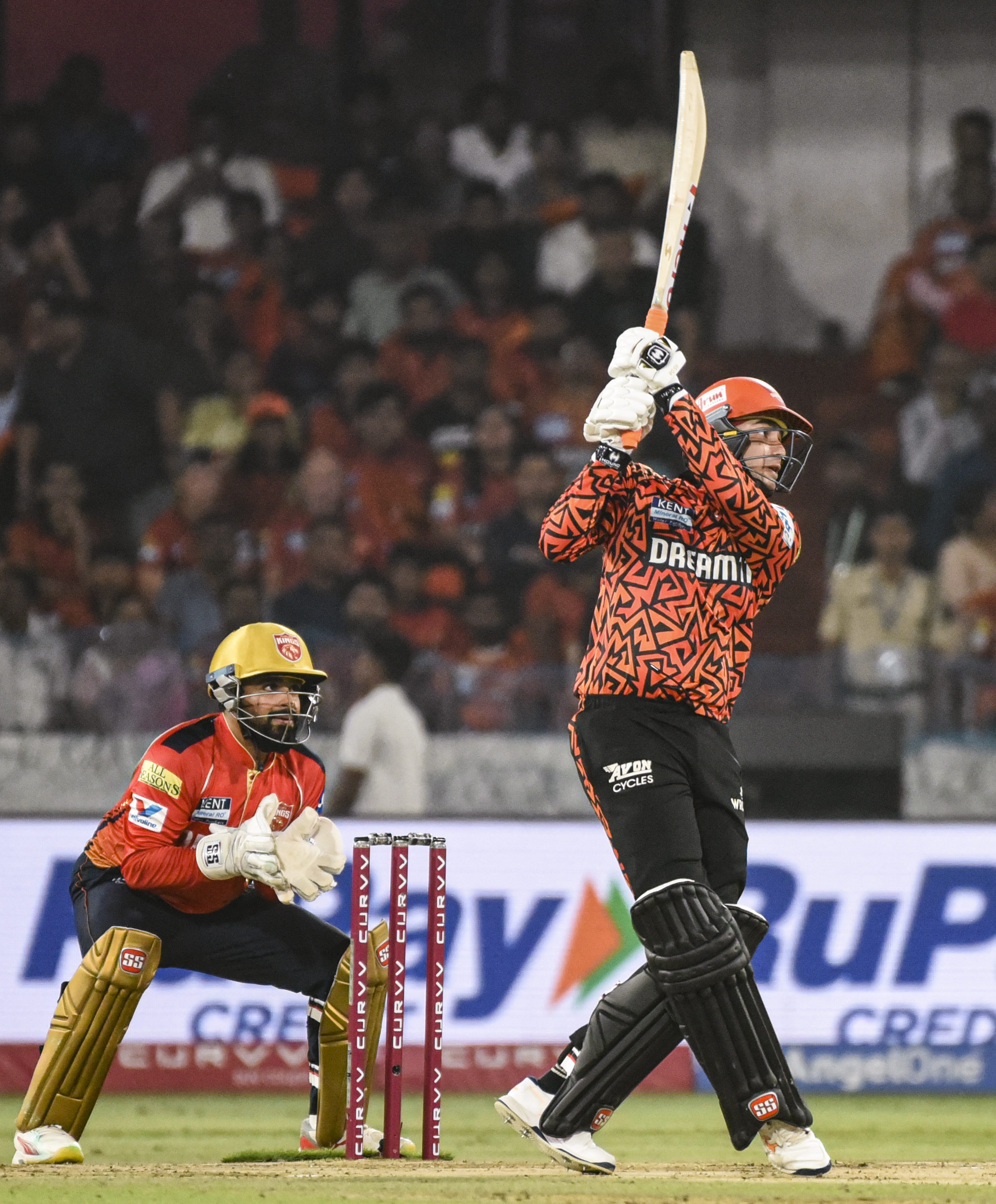 Hyderabad: Sunrisers Hyderabad’s Abhishek Sharma plays a shot during an Indian Premier League (IPL) 2025 T20 cricket match between Sunrisers Hyderabad and Punjab Kings, at Rajiv Gandhi International Cricket Stadium, Uppal, in Hyderabad, Saturday, April 12, 2025. (PTI Photo) (PTI04_12_2025_000533B)