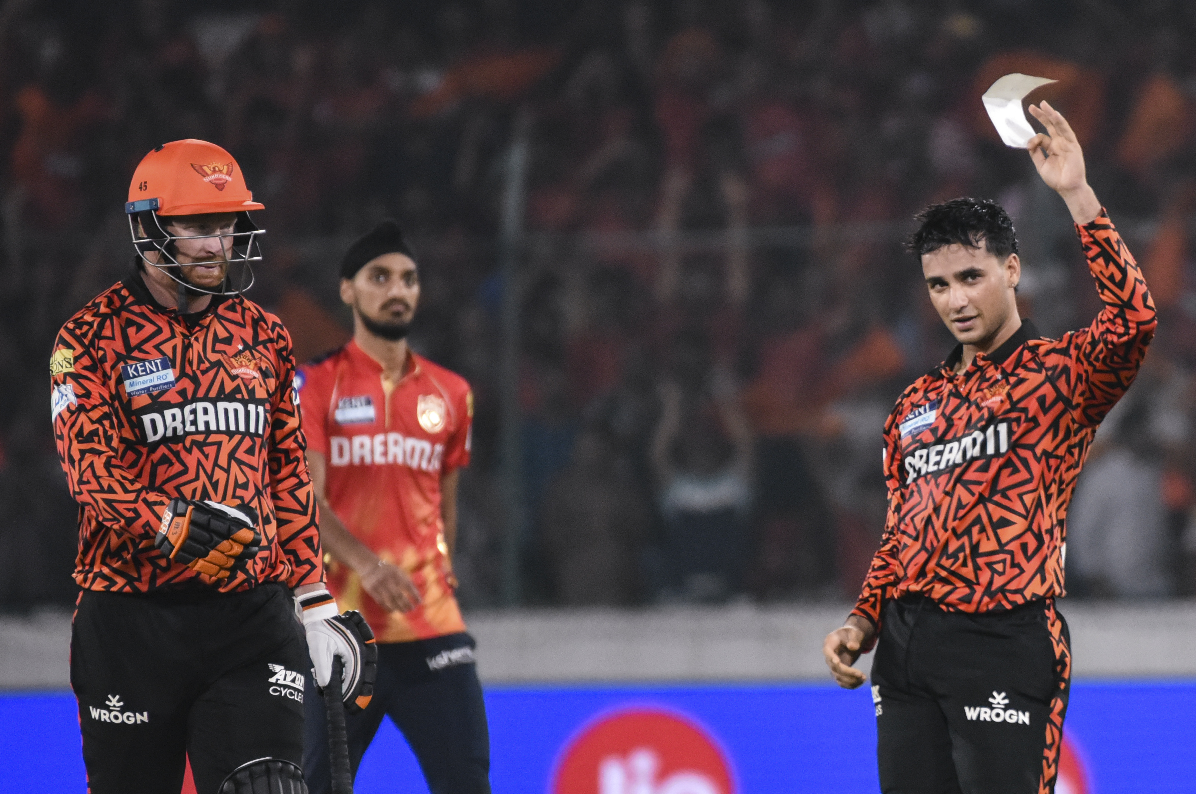 Hyderabad: Sunrisers Hyderabad’s Abhishek Sharma celebrates his century during an Indian Premier League (IPL) 2025 T20 cricket match between Sunrisers Hyderabad and Punjab Kings, at Rajiv Gandhi International Cricket Stadium, Uppal, in Hyderabad, Saturday, April 12, 2025. (PTI Photo) (PTI04_12_2025_000563B)