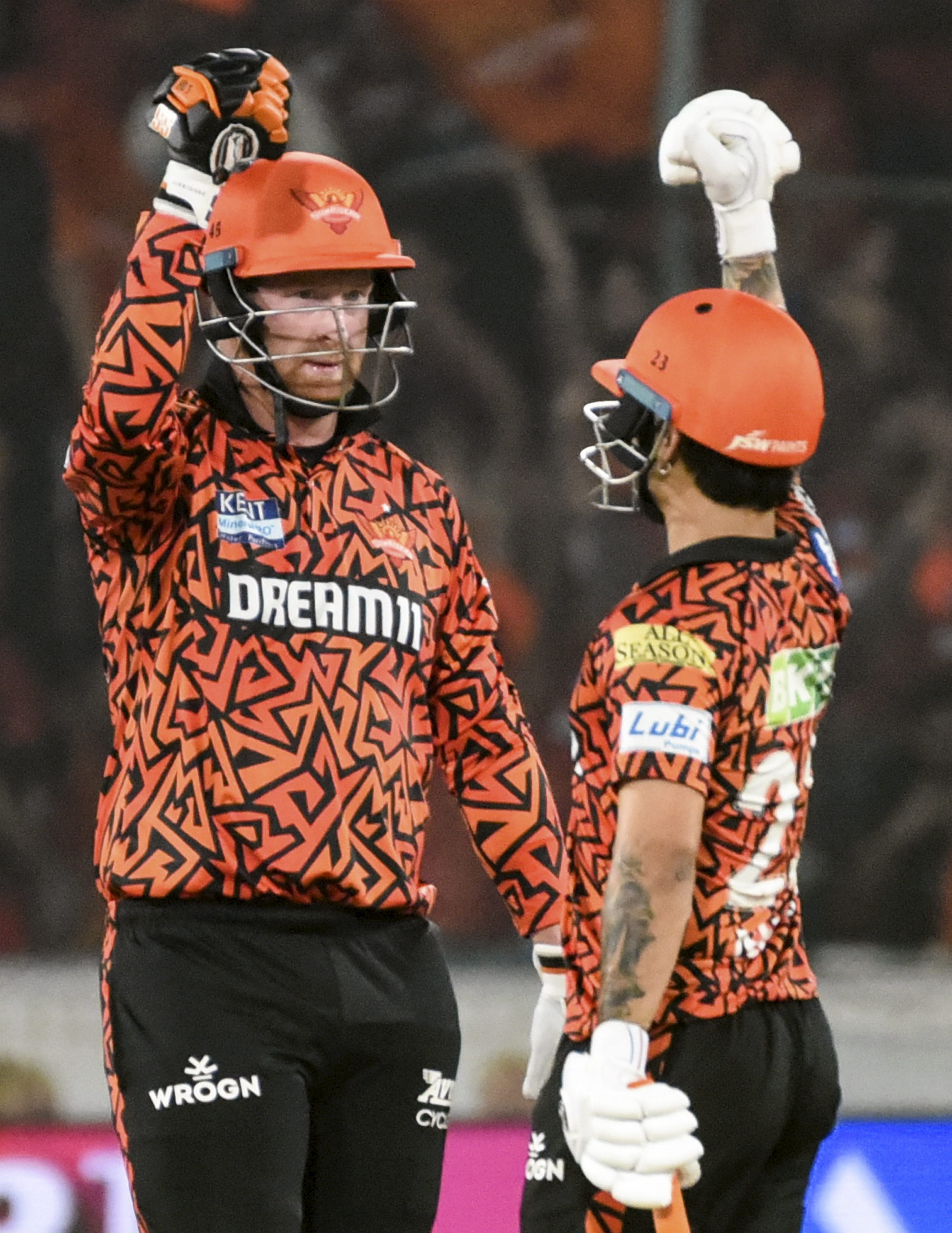 Hyderabad: Sunrisers Hyderabad’s Heinrich Klaasen and Ishan Kishan celebrate after winning an Indian Premier League (IPL) 2025 T20 cricket match between Sunrisers Hyderabad and Punjab Kings, at Rajiv Gandhi International Cricket Stadium, Uppal, in Hyderabad, Saturday, April 12, 2025. (PTI Photo) (PTI04_12_2025_000599B)