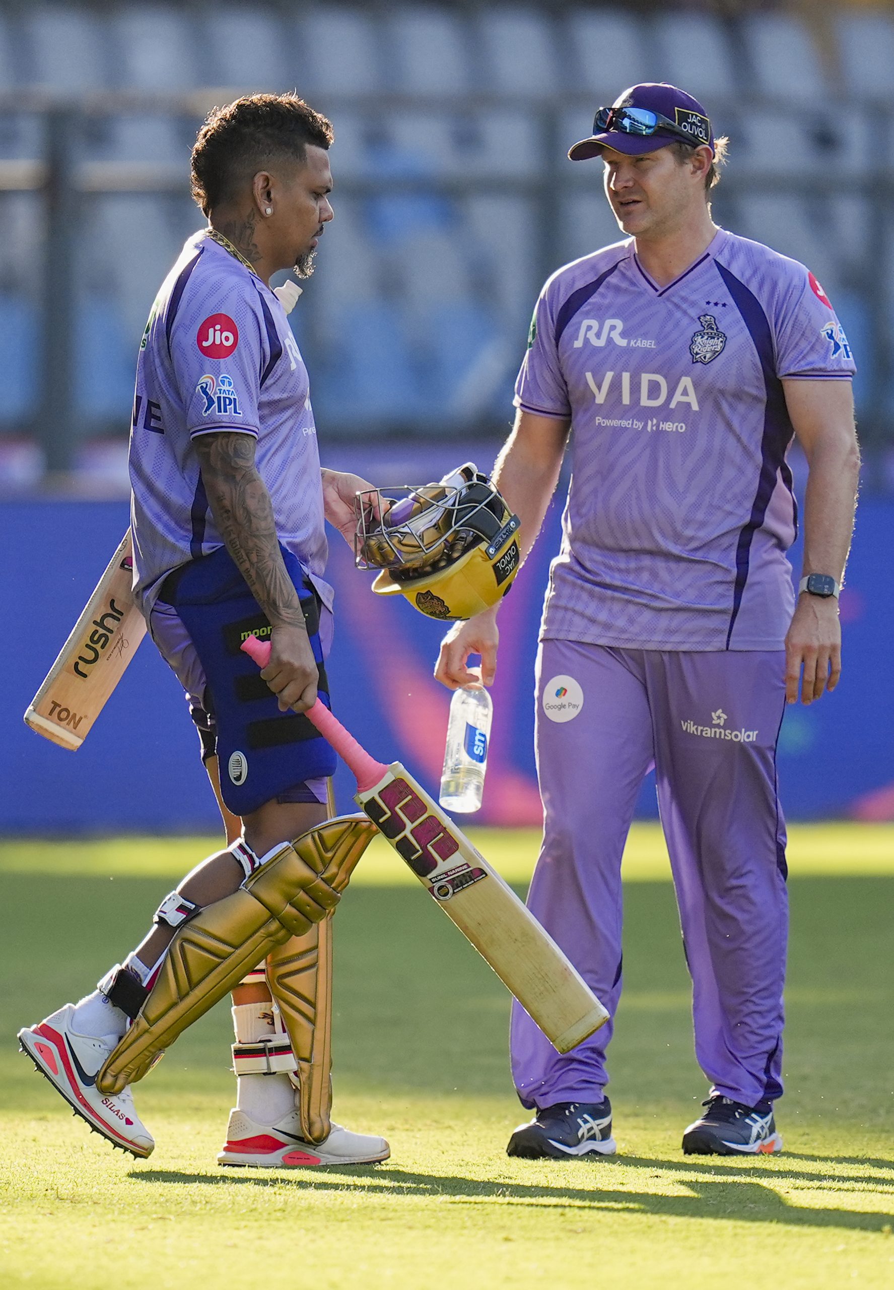 Mumbai: Kolkata Knight Riders' Sunil Narine, left, and Assistant Coach Shane Watson during a practice session ahead of an Indian Premier League (IPL) 2026 T20 cricket match against Mumbai Indians, at the Wankhede Stadium, in Mumbai, Maharashtra, Saturday, March 28, 2026. (PTI Photo/Kunal Patil) (PTI03_28_2026_000337B)