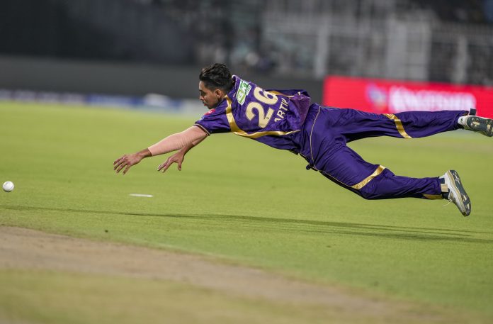 Kolkata: Kolkata Knight Riders’ Kartik Tyagi attempts a catch during the Indian Premier League (IPL) 2026 cricket match between Kolkata Knight Riders and Sunrisers Hyderabad, at Eden Gardens in Kolkata, West Bengal, Thursday, April 2, 2026. (PTI Photo/Manvender Vashist Lav)(PTI04_02_2026_000329B)