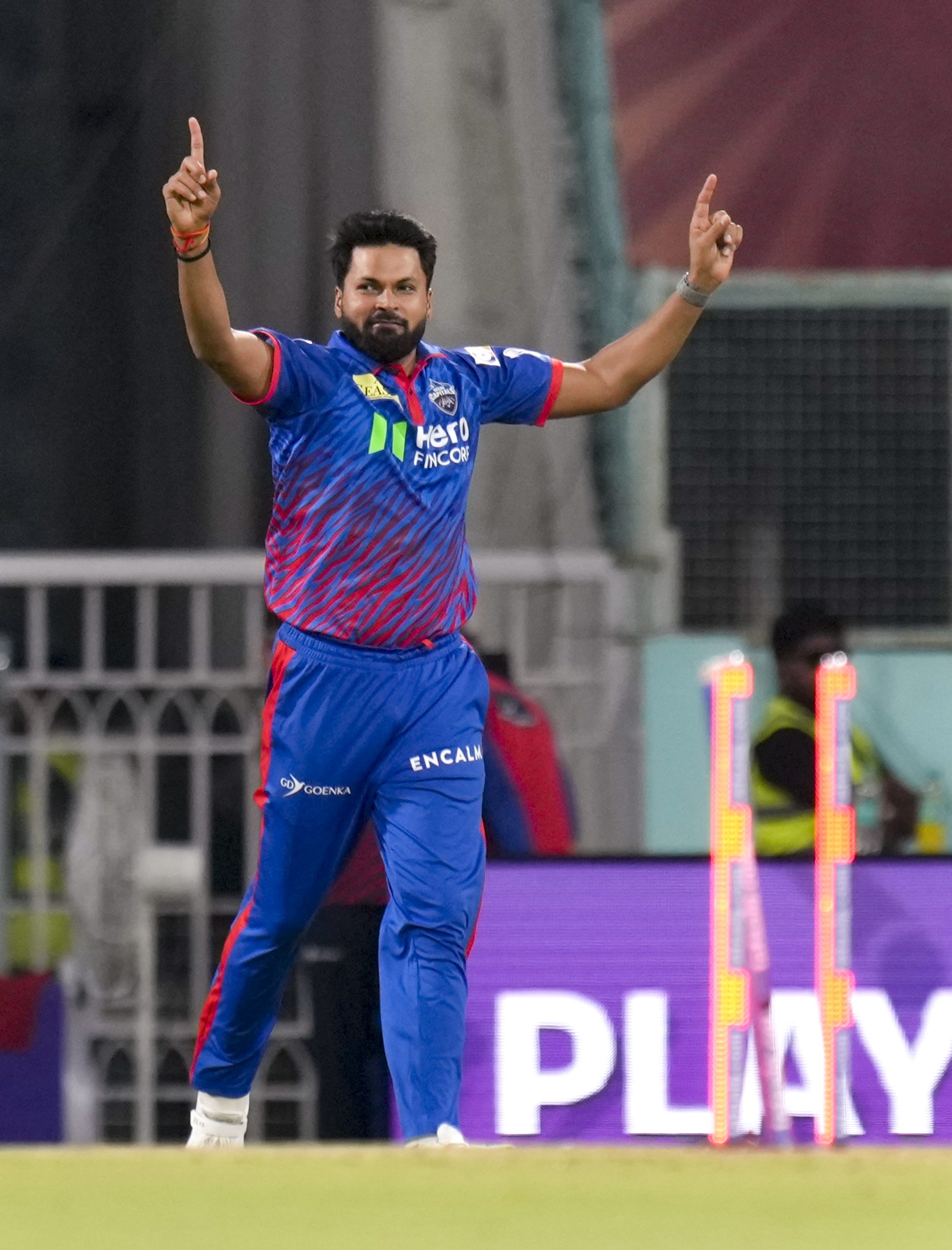 Lucknow: Delhi Capitals’ Mukesh Kumar celebrates after the wicket of Lucknow Super Giants’ Nicholas Pooran during the Indian Premier League (IPL) 2026 cricket match between Lucknow Super Giants and Delhi Capitals, at Ekana Stadium in Lucknow, Wednesday, April 1, 2026. (PTI Photo/Shahbaz Khan)(PTI04_01_2026_000467B)